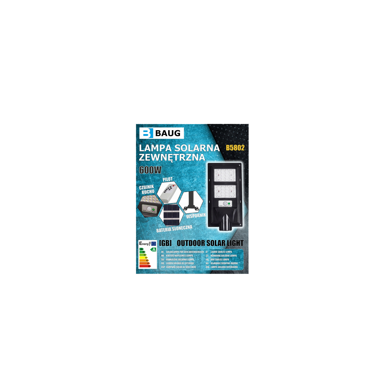 Pe partea superioară a lămpii se află un panou solar care colectează energia solară în timpul zilei și este stocată în bateria încorporată.