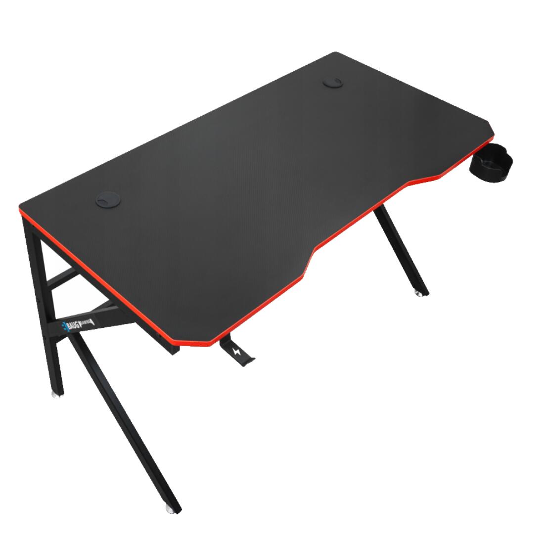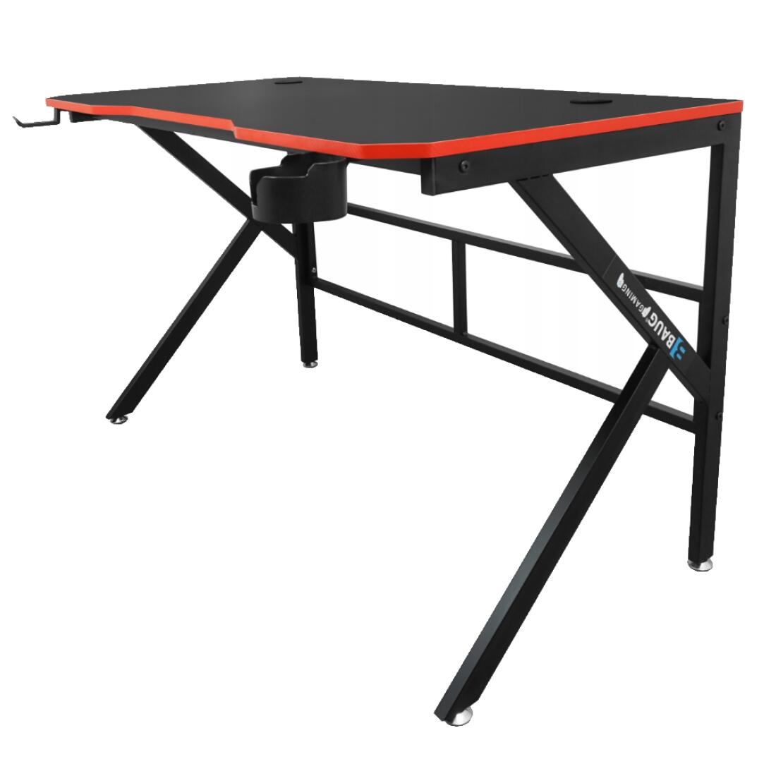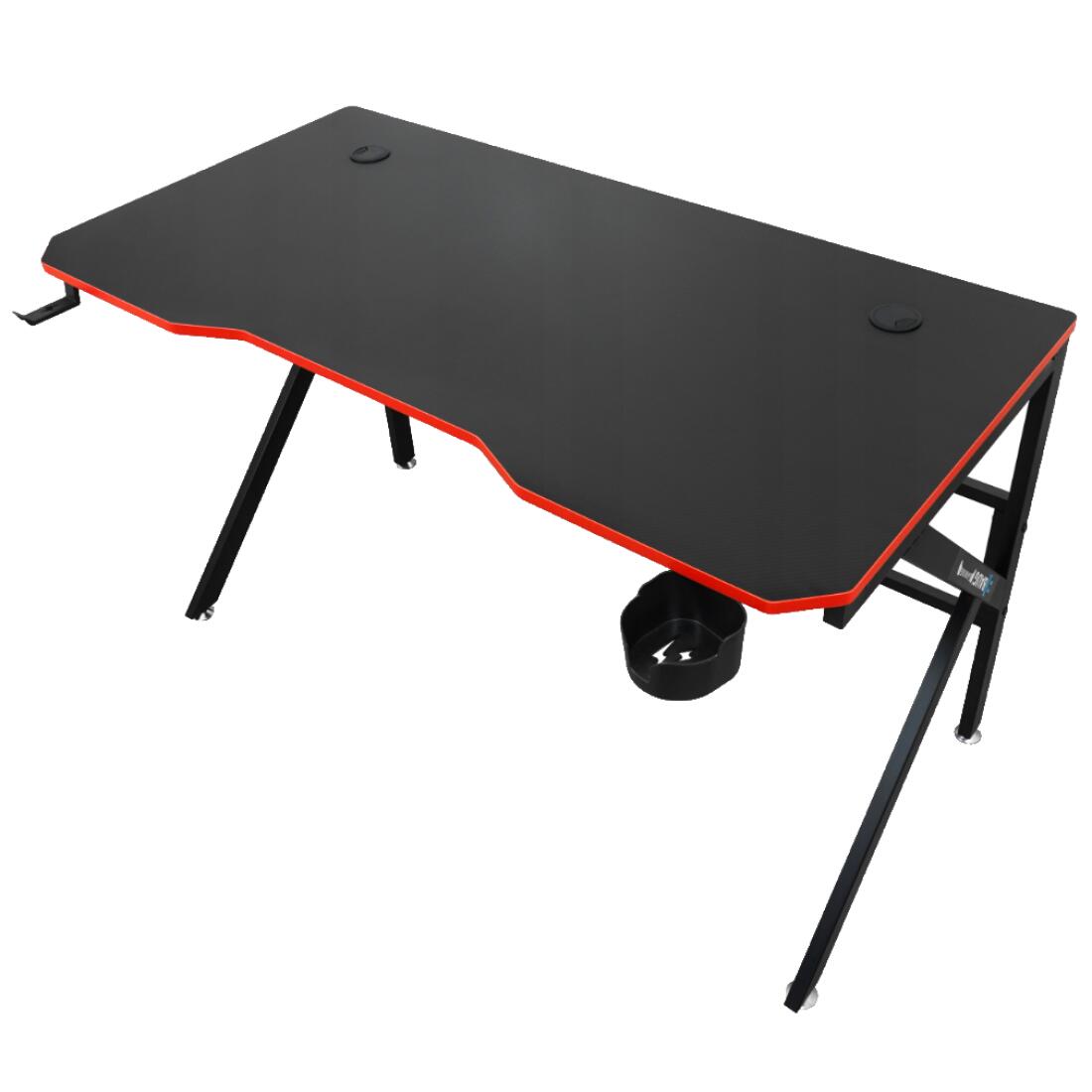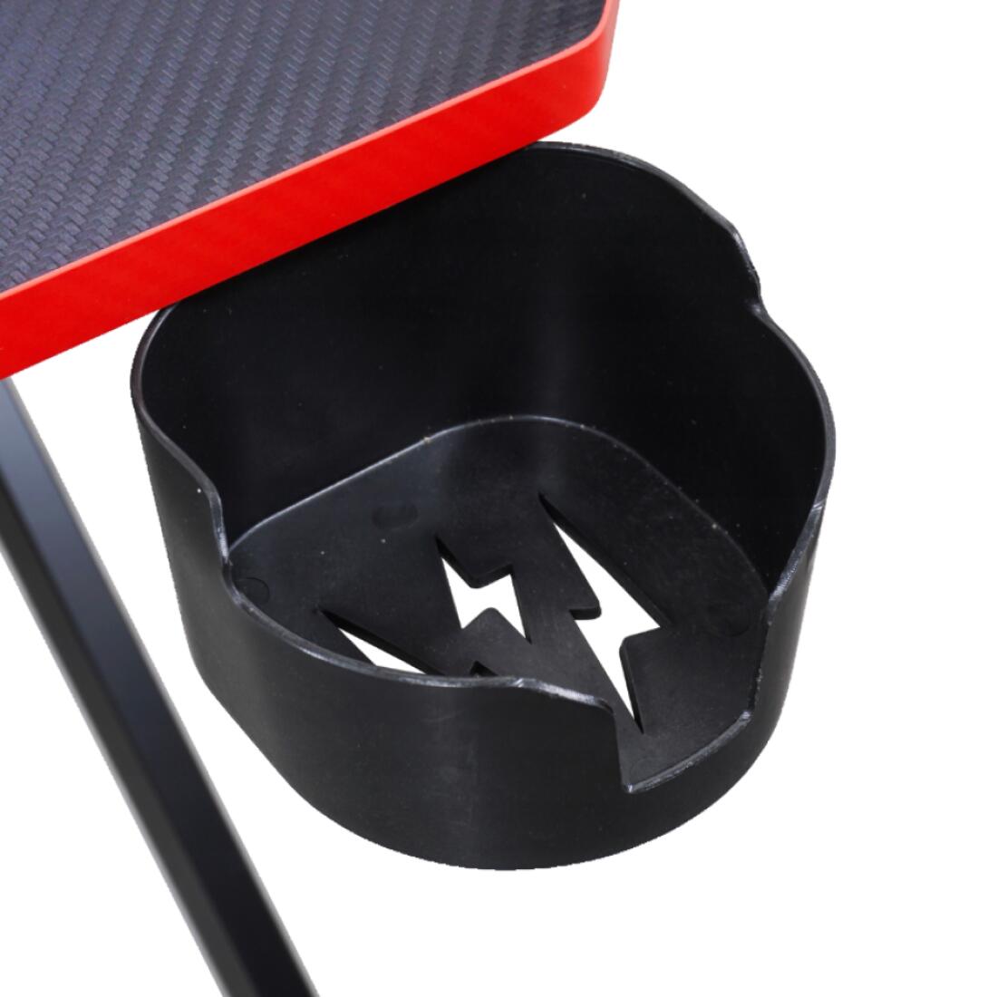 Piciorele sunt montate pe ambele părți ale biroului, astfel încât indiferent de instalare, stația dvs. de jocuri va fi întotdeauna ordonată. Un birou dotat cu suport pentru băuturi și căști.