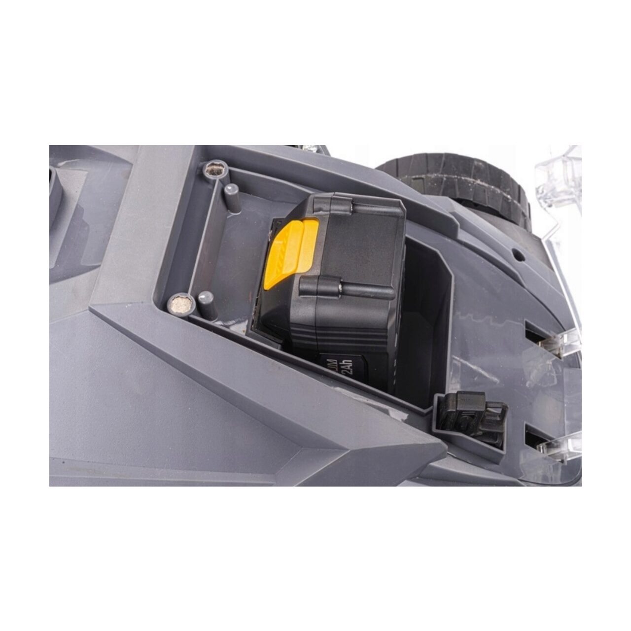 Există un slot sub capacul bateriei unde este foarte ușor să instalați bateria. Lângă ea, există un loc pentru o cheie, fără de care este imposibil să porniți mașina de tuns iarba. Acest lucru oferă o garanție directă că dispozitivul nu poate fi pornit, de exemplu de către copiii mici.