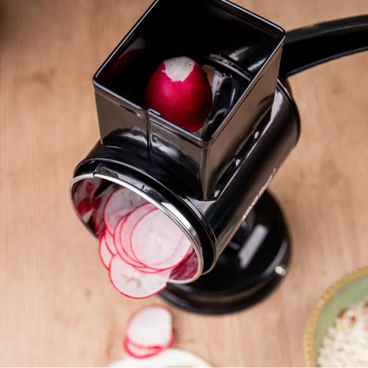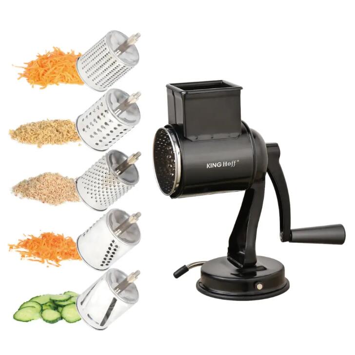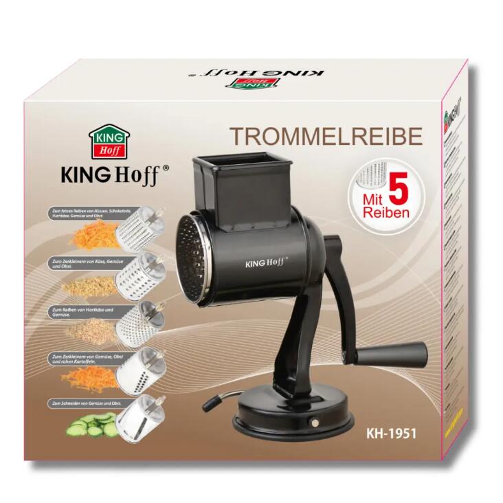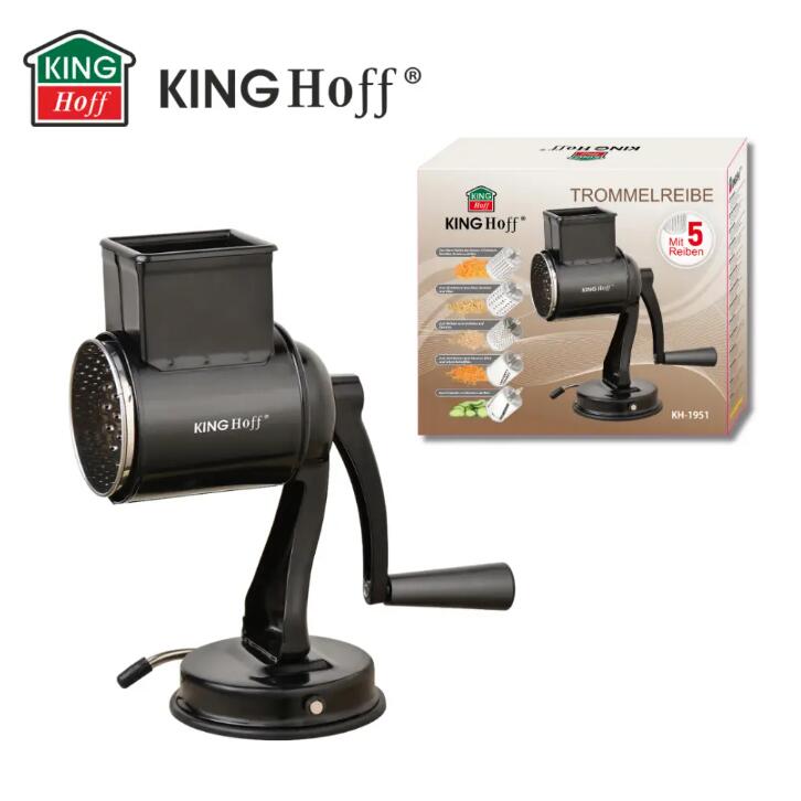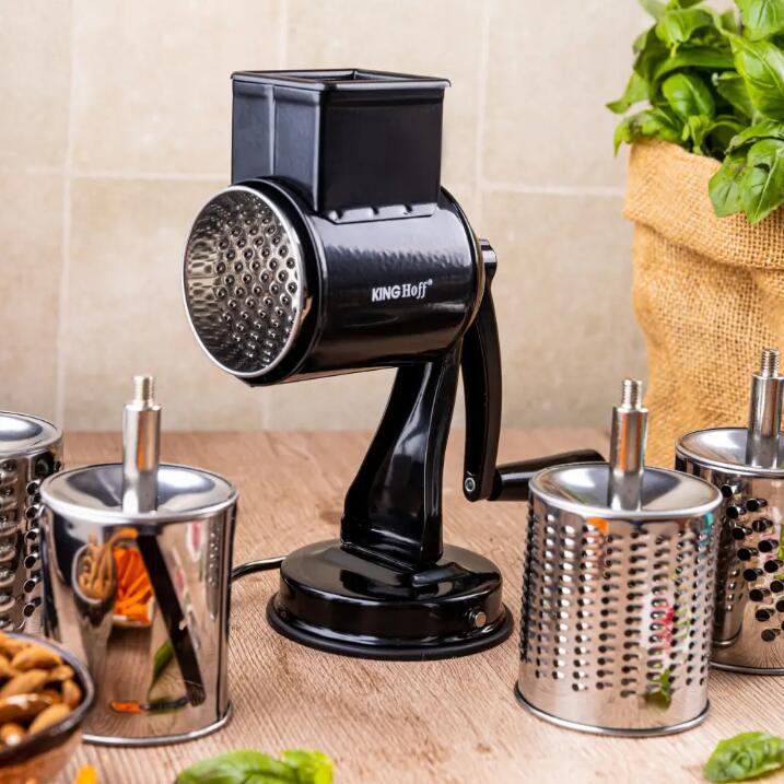 Răzătoarea cu tambur KINGHoff KH-1951 este un instrument indispensabil care va ușura prepararea alimentelor și va oferi bucătăriei tale o notă profesională. Cu construcția sa robustă din oțel inoxidabil de înaltă calitate și finisajul elegant negru, dispozitivul nu numai că arată grozav, dar garantează și durabilitate și confort în utilizare. Ideal pentru răzuirea, felierea și mărunțirea unei varietăți de ingrediente - de la legume și fructe la brânzeturi și nuci.