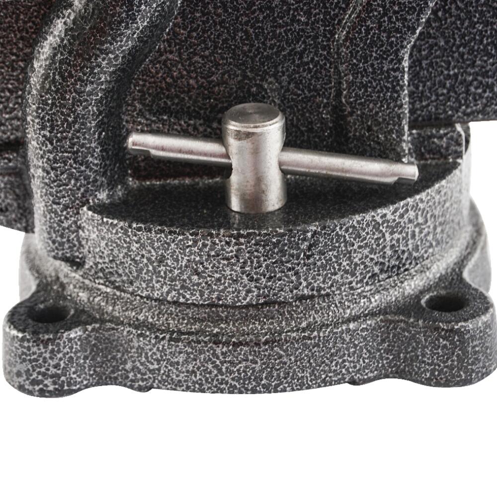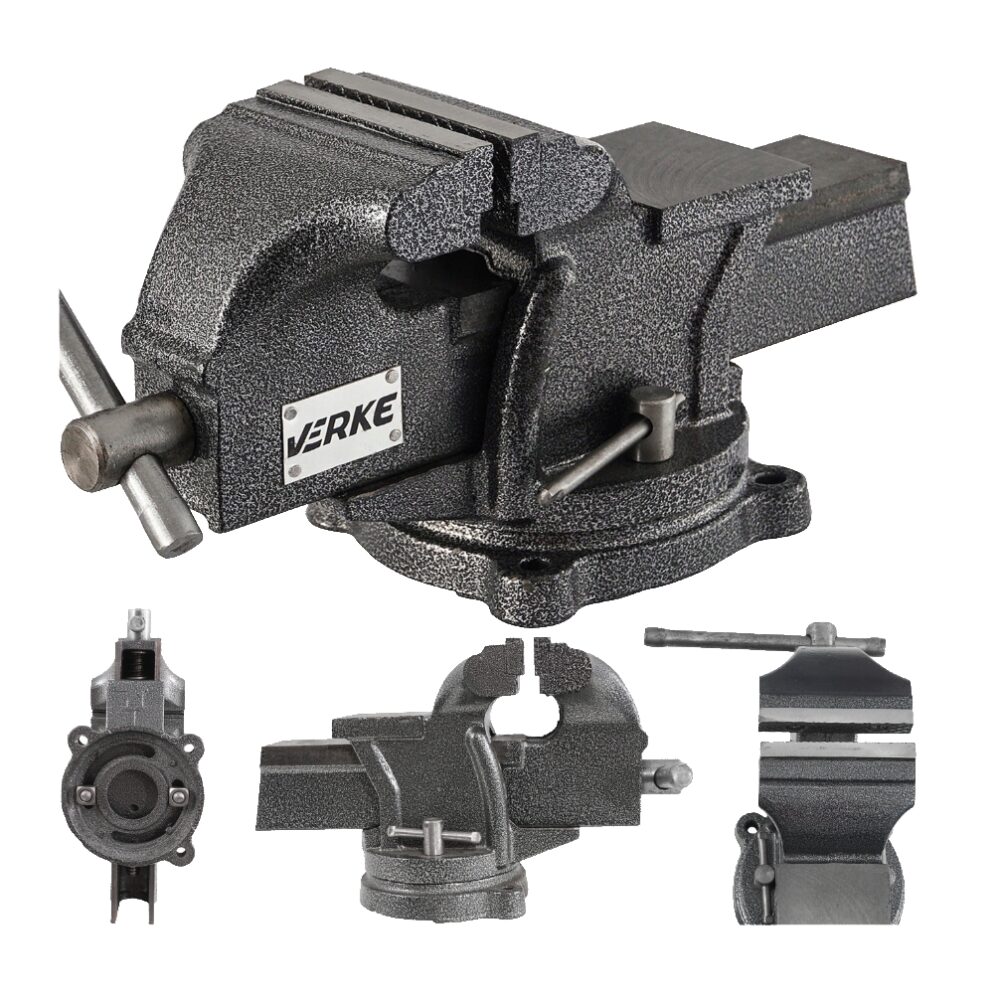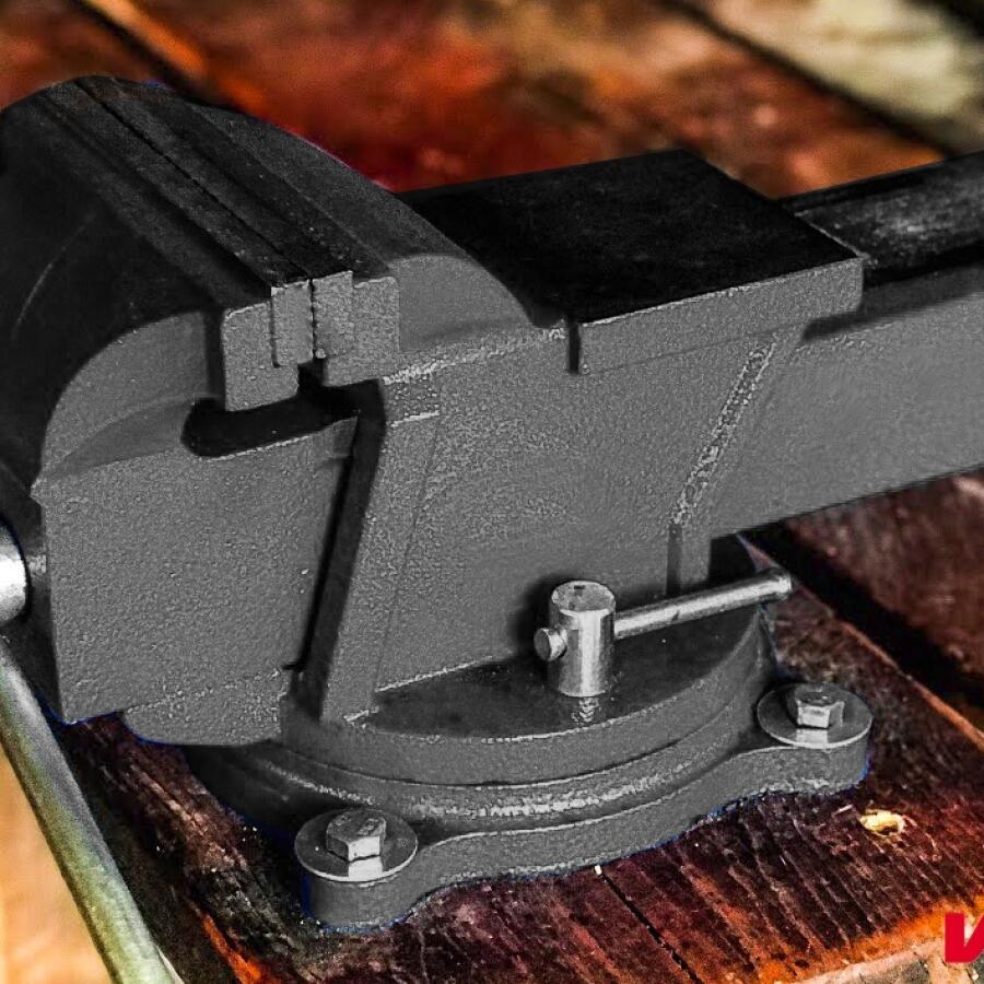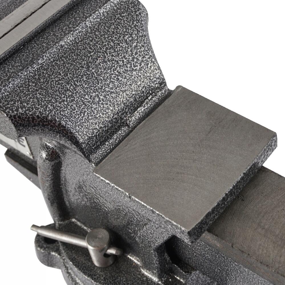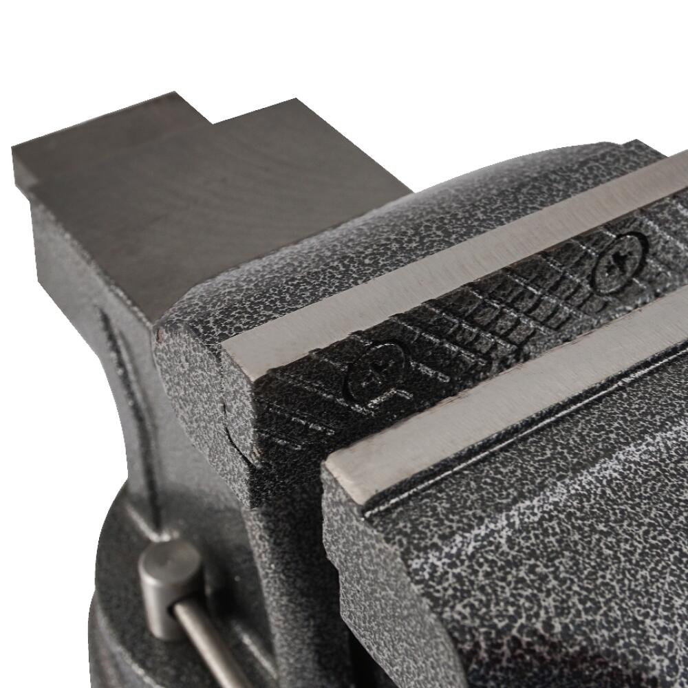 Corp din fontă gri, fălci înlocuibile de 100 mm și nicovală din oțel călit.
