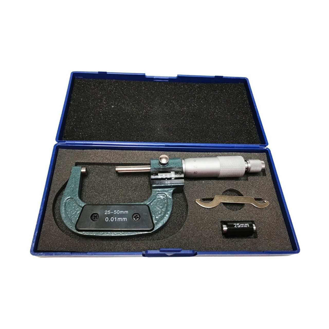 Micrometru (cunoscut și sub numele de micrometru, pentru a-l deosebi de un micrometru ca unitate de măsură) - un instrument de măsurare utilizat pentru măsurarea precisă. Funcționarea dispozitivului se bazează pe utilizarea unui șurub micrometru și a unui vernier. Un șurub micrometru este un șurub realizat foarte precis, cu pasul filetului de 1 mm conectat la tamburul micrometric, pe circumferința căruia este gravată o scară (vernier). La tamburul micrometrului este conectat un buton cu un ambreiaj cu clichet, care asigură o presiune adecvată, constantă a fălcilor. Presiunea inadecvată cauzează inexactități semnificative de măsurare. Totul este ambalat într-o cutie practică, rezistentă.