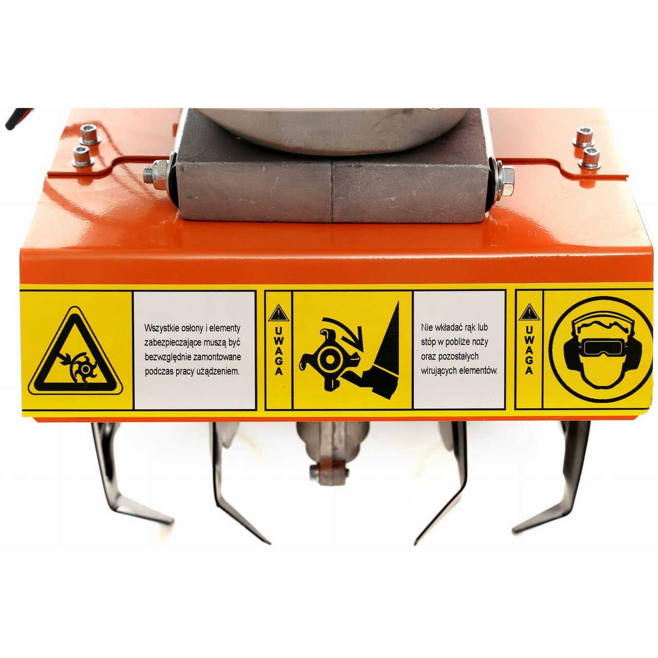 Secțiunea de lucru este echipată cu un set de lame de tăiere care sapă automat în sol, facilitând ghidarea mașinii în timpul funcționării.
