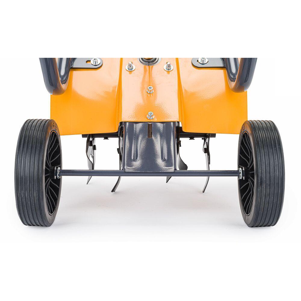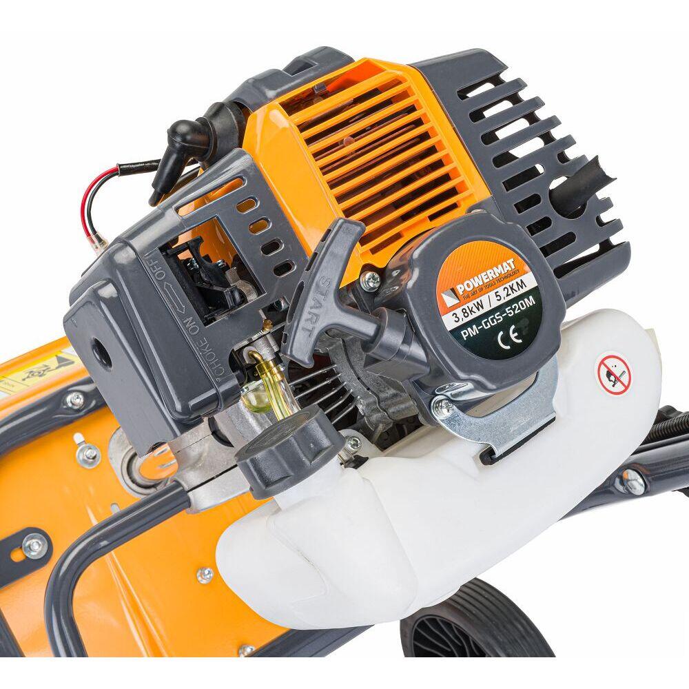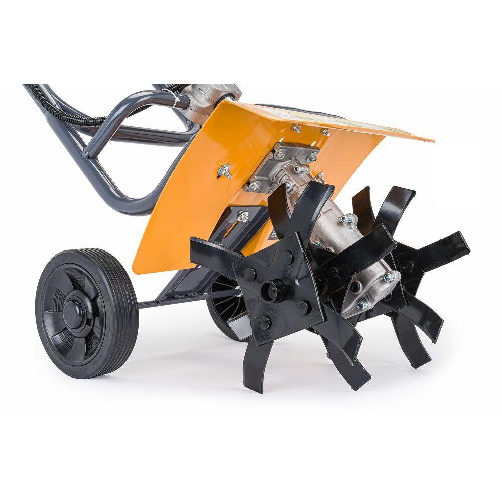 Pe partea din spate a dispozitivului există două roți rutiere. Sunt foarte utile pentru reglarea profunzimii de lucru a dispozitivului și pentru mișcarea acestuia. Un motor eficient in doi timpi cu o capacitate de 52 cm3 generează o putere de 5,2 CP. Un demaror manual și un carburator cu diafragmă de inaltă clasă, cu pompă de combustibil și forță de aspirație reglabilă, facilitează pornirea instantanee a motorului. O manetă cu un cablu de cablu va incepe cu ușurință transmisia de acționare de la motor la role cu cuțite. Pe maner există și un buton pentru a stinge rapid motorul.