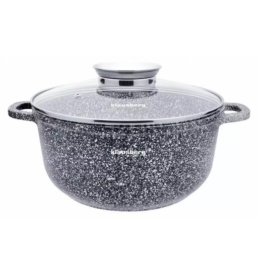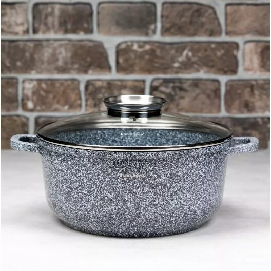 Oală din aluminiu turnat sub presiune, rezistentă la căldură, cu acoperire ceramică marmorată pentru gătit sănătos.