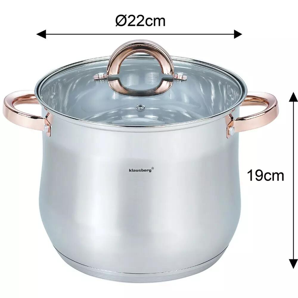 Oală gastro 7 litri 22 cm cu capac din sticlă și mânere din aur roz de Klausberg.
