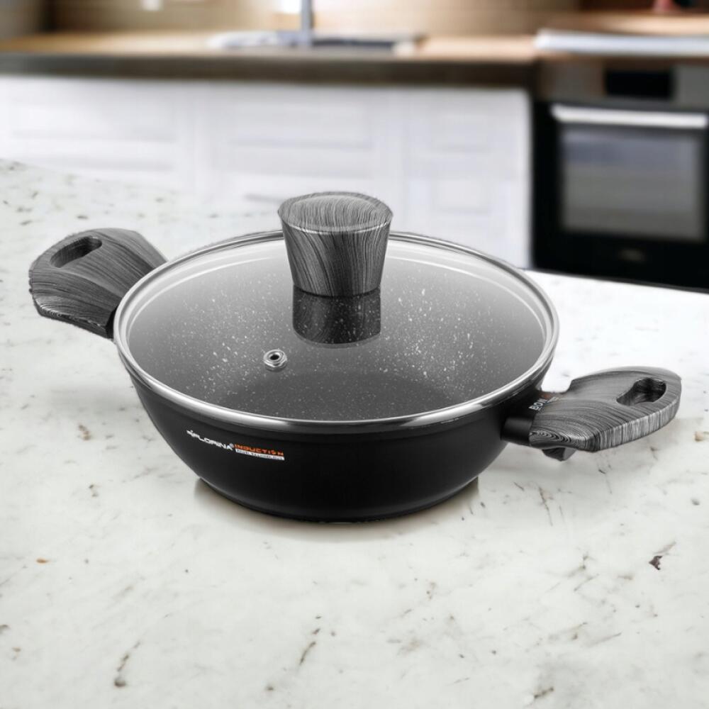 O oală joasă cu inducție completă se încălzește de 3 ori mai repede decât o oală cu inducție punctiformă. Aceasta înseamnă că gătești mai puțin timp, ceea ce se traduce prin economii de energie. Mai mult, timpul de gătit mai scurt se traduce prin reducerea la minimum a pierderii valorilor valoroase din vas, ceea ce este important. Oala de aluminiu propusă este perfectă pentru bucătăria ta! Acoperit cu un strat antiaderent la interior, este extrem de ușor de curățat.