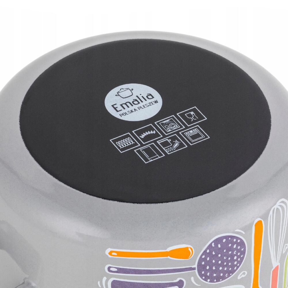 Oala emailată Staffio, gri, decorată, are un capac de sticlă care vă permite să monitorizați gătirea alimentelor. Vasul se poate spăla în mașina de spălat vase.