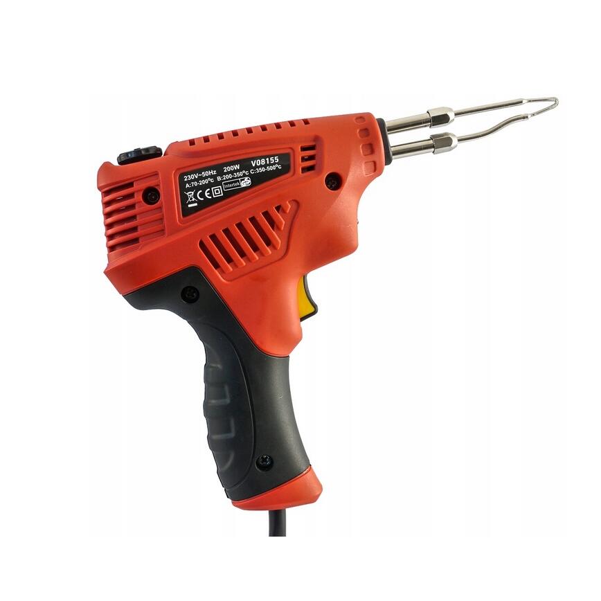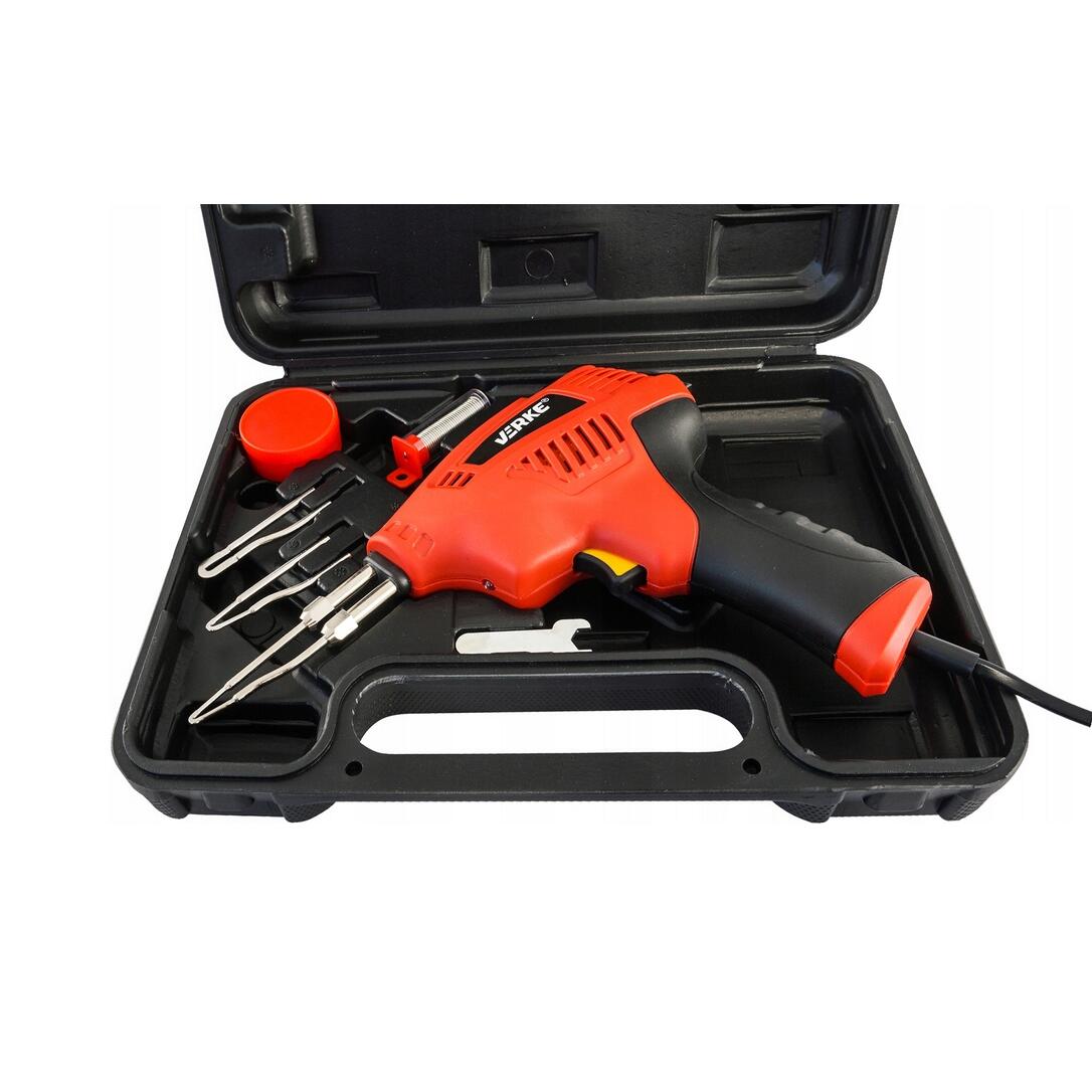 Pistol de lipit cu transformator VERKE este un dispozitiv pentru conectarea permanentă a elementelor. Temperatura se obține prin trecerea unui curent mare printr-un fir, care este și vârful. Controlul temperaturii permite ajustarea optimă a materialelor care se îmbină și a parametrilor. Datorită puterii sale mari de până la 200 W, fierul de lipit se încălzește rapid și este gata de utilizare. Este posibil să funcționeze în trei intervale de temperatură A.: 70-200°C, B. 200-350°, C. 350-500°C. Pistolul de lipit VERKE este proiectat să funcționeze în următorul mod: 12 secunde de lipit, 48 de secunde de pauză. Fabricat din componente de cea mai înaltă calitate, garantează o funcționare fără probleme pentru o perioadă lungă de timp.