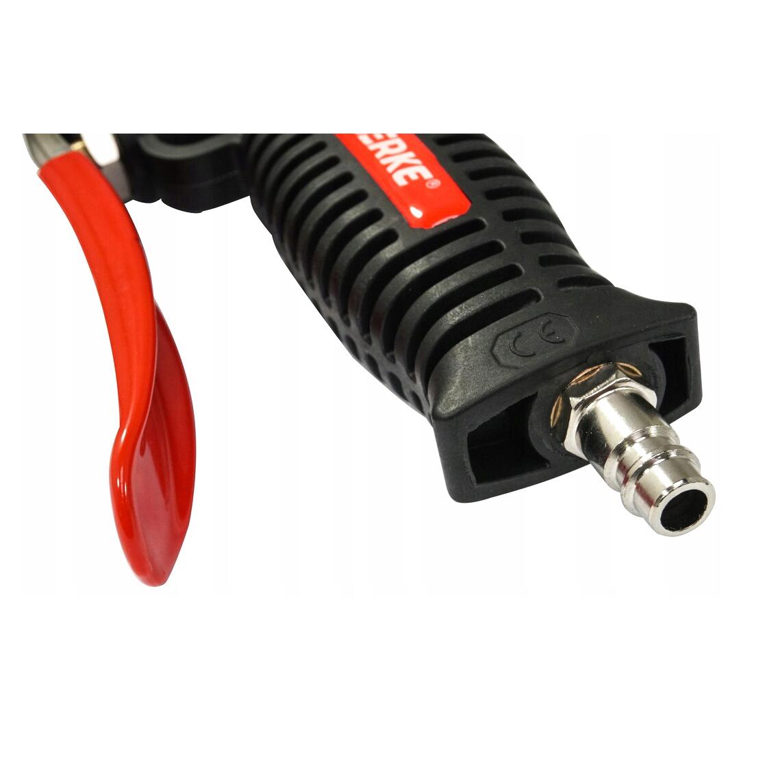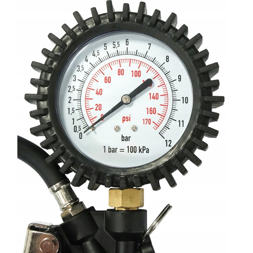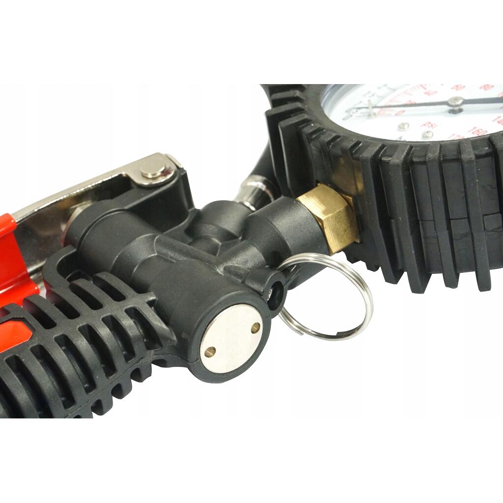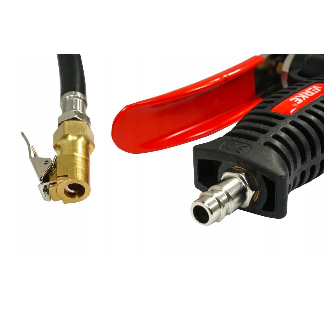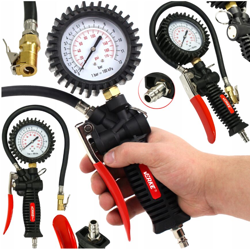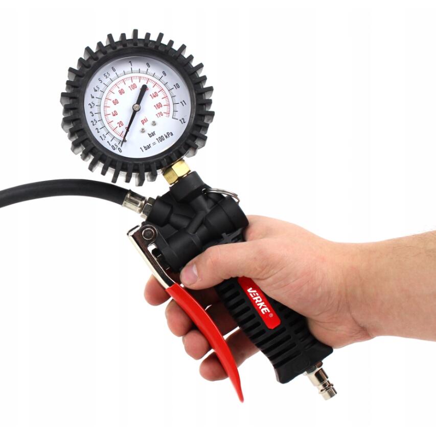 Un pistol solid și fiabil, cu un manometru de presiune în anvelope. Terminat cu un ștecher standard potrivit pentru o cuplare rapidă. Ceasul este asigurat cu un capac cauciucat pentru a-l proteja de eventuale daune. La îndemâna degetului mare, este o supapă care vă permite să reglați aerul din roată. Pistolul este realizat din materiale de înaltă calitate. Perfect pentru atelierele auto și instalațiile de vulcanizare.