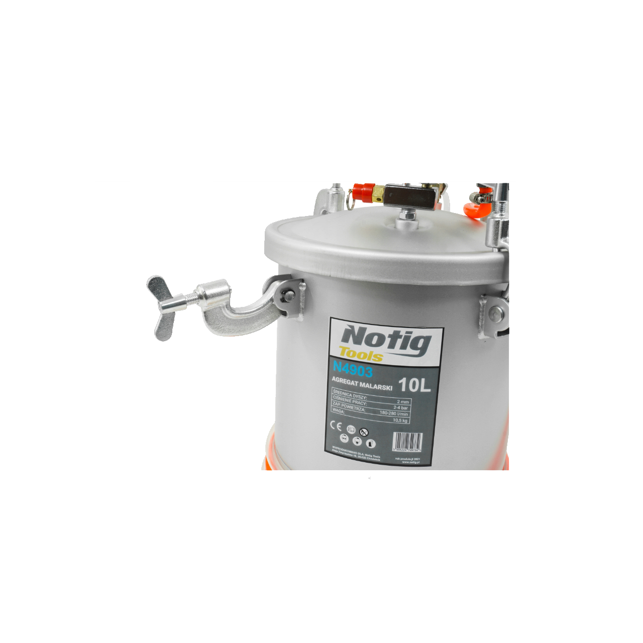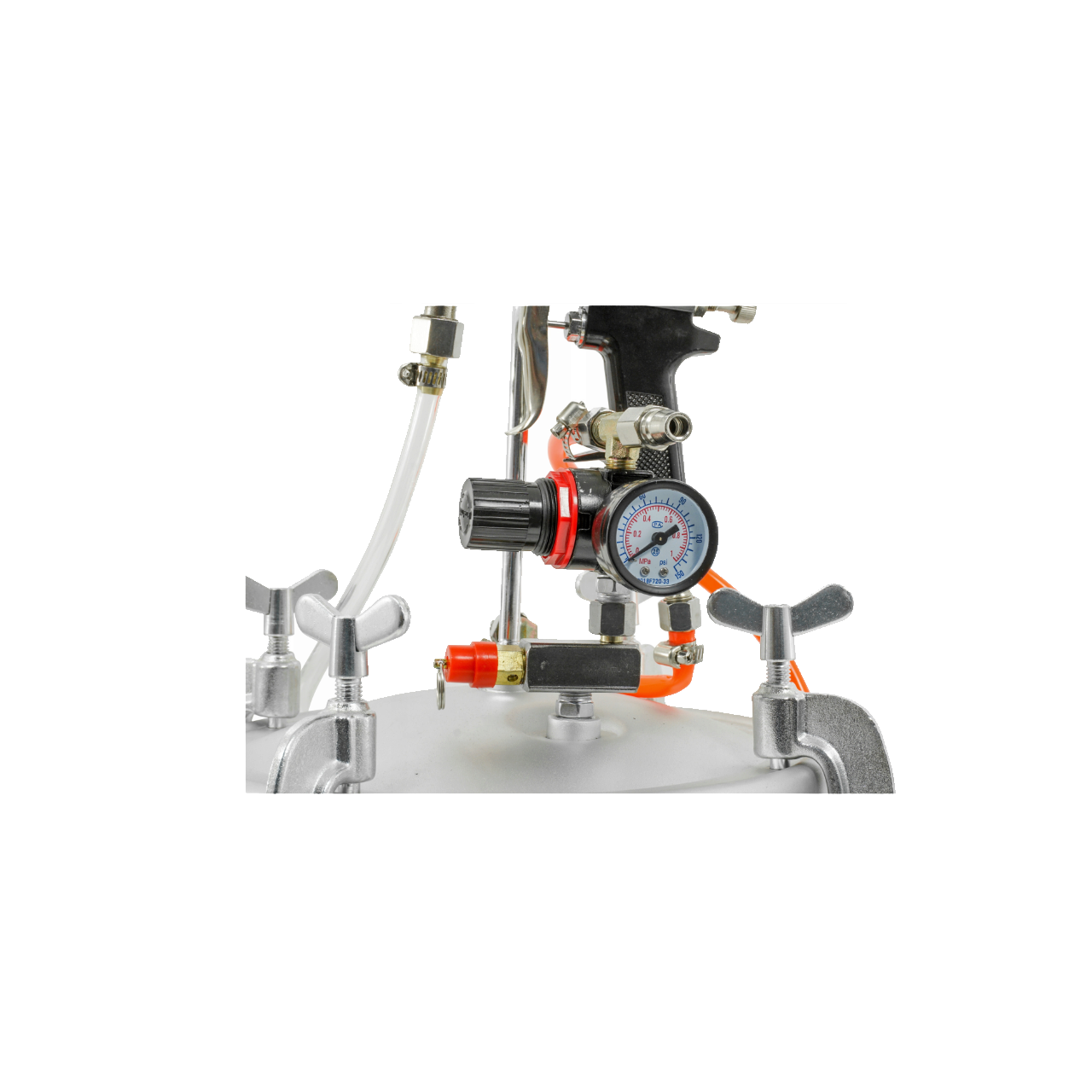 Pistol de pulverizare pneumatic utilizat împreună cu un rezervor de vopsea. Setul se caracterizează prin parametri de pulverizare foarte buni și viteză mare de vopsire. Sistemul de pulverizare permite utilizarea unei cantități mari de vopsea, care poate fi aplicată rapid, economisind timp și bani. Vas sub presiune din oțel neted, cu rezistență ridicată la coroziune. Masina poate fi folosită pentru a aplica practic toate vopselele și lacurile, adezivii, emulsiile, petele, vopselele anticorozive, tapetele cu spray.