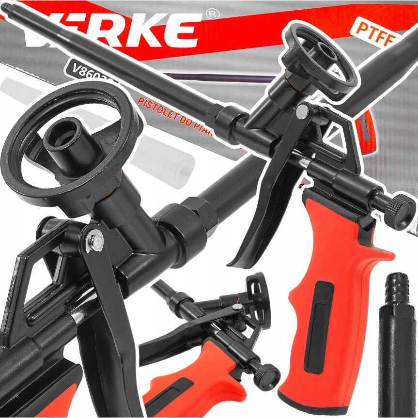 Pistol pentru spumă de asamblare conceput pentru dozarea precisă a spumei PU din cilindri tipici disponibili pe piață. Permite utilizarea repetată și facilitează lucrări precum: etanșarea, instalarea ferestrelor și ușilor, umplerea golurilor din izolație, etanșarea și izolarea pereților despărțitori și izolarea pereților și a acoperișurilor. V86032