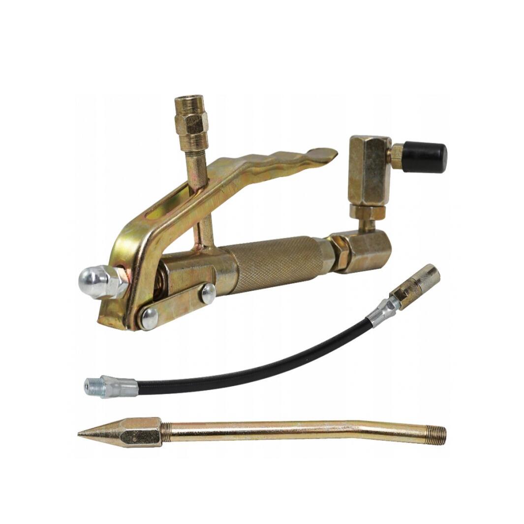 Pistol conceput pentru pistoale pneumatice de gressat. Manopera de inalta calitate. Echipamentul include un furtun rigid (il puteti inlocui cu usurinta cu unul flexibil) cu un varf care sustine majoritatea niplurilor de unsoare.
