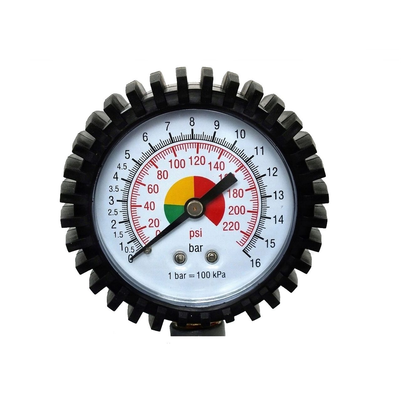 Echipat cu un manometru mare lizibil într-un capac de cauciuc care protejează împotriva șocurilor și impacturilor.