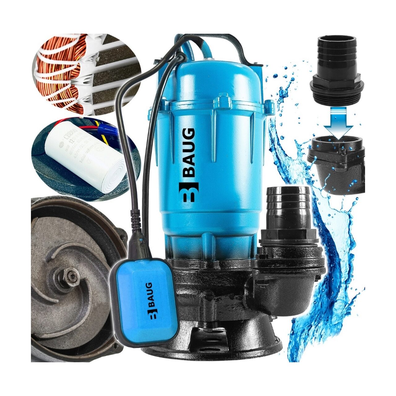 Pompă masivă, solidă, de neînlocuit într-o fermă, construcții, grădini. Va fi folosit pentru pomparea rapida a foselor septice, schimbarea apei in rezervoare sau camerele de uscare inundate cu apa. Aparatul are o capacitate mare de 15.000 l/h cu un consum redus de energie. Motorul de 0,75kW se caracterizeaza printr-o functionare silentioasa si un consum redus de energie, ceea ce se traduce prin costuri de operare reduse. Este echipat cu o turbină de măcinat cu pale profilate. Acesta va asigura eliminarea rapidă și eficientă a apei. Carcasa pompei este realizată din fontă foarte durabilă și rezistentă, care protejează dispozitivul împotriva substanțelor chimice și a deteriorărilor mecanice. Pompa este complet submersibila. Are un întrerupător cu plutitor care împiedică funcționarea „uscata” a pompei.