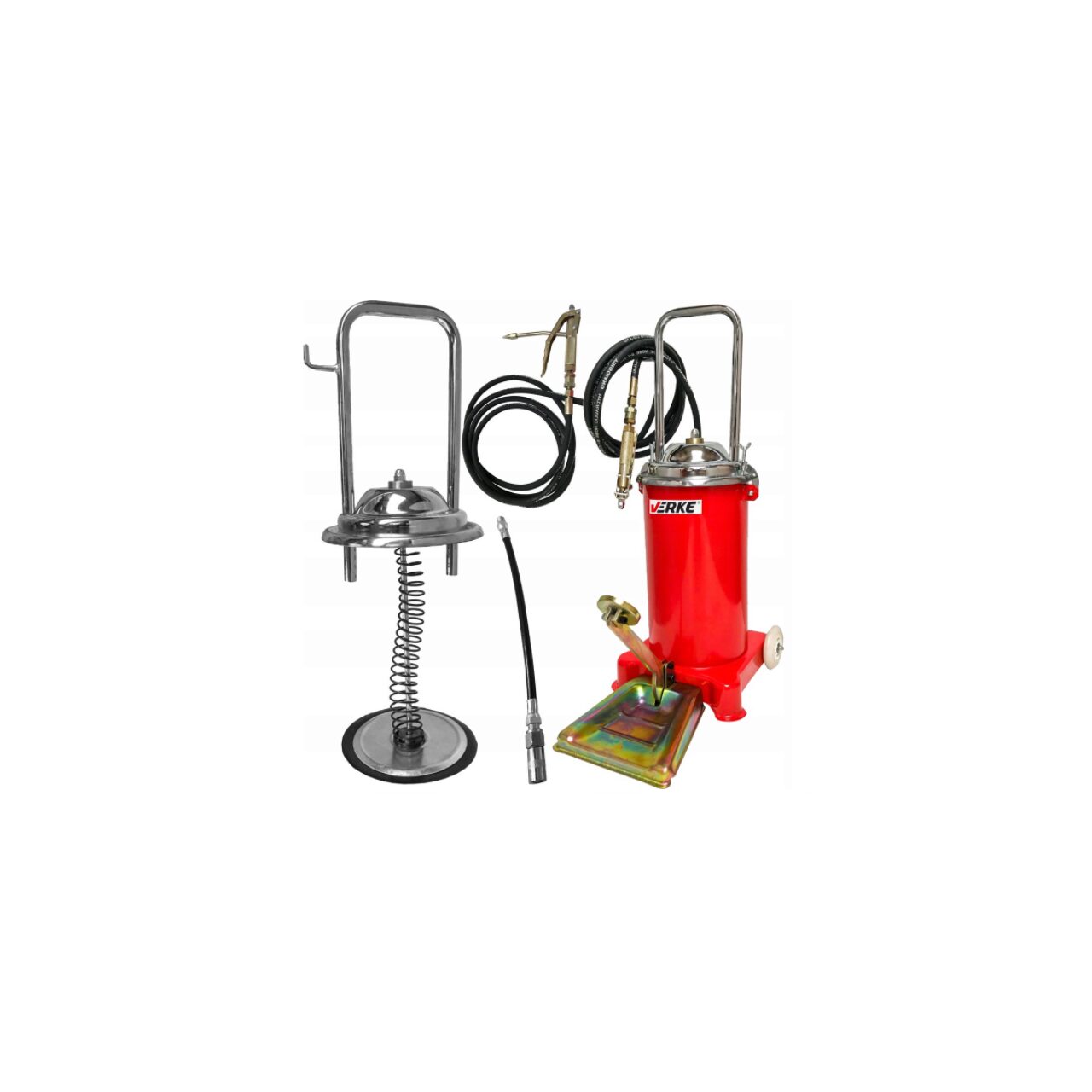 Pistolul de gresat marca Verke este un dispozitiv folosit pentru ungerea sub presiune a elementelor mecanice precum arbori, bolțuri, rulmenți, articulații etc. Este realizat dintr-un cilindru de oțel cu o capacitate de 15l care permite o funcționare continuă și eficientă. Întregul este realizat din materiale de înaltă calitate rezistente la efectele pe termen lung ale grăsimilor și uleiurilor. Toate etanșările și supapele sunt realizate cu cea mai mare precizie și permit lucrul sub presiune de până la 30 MPa. Setul include doua varfuri, rigide si flexibile care se potrivesc majoritatii calamitelor. Rotile garanteaza mobilitate si usurinta in transport.