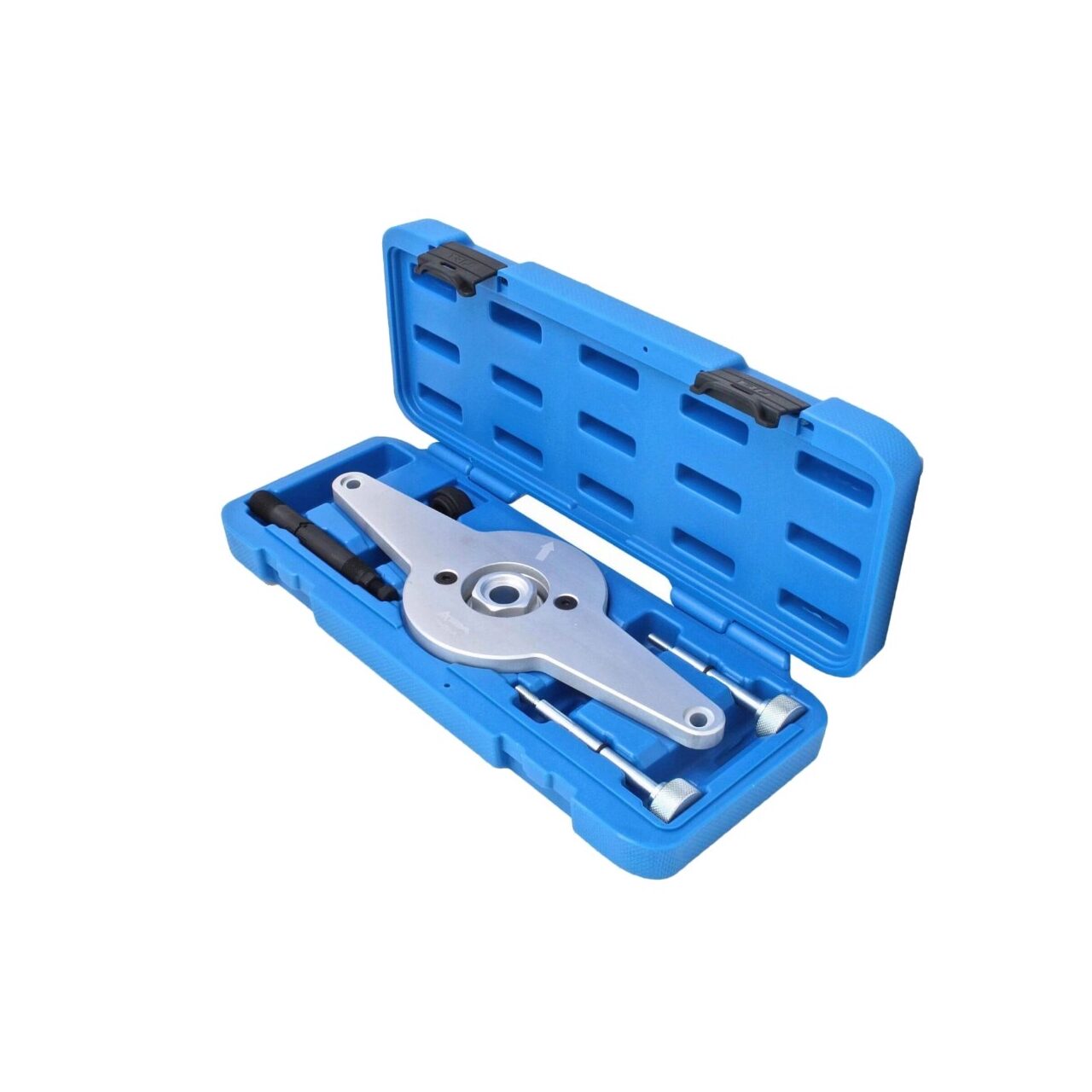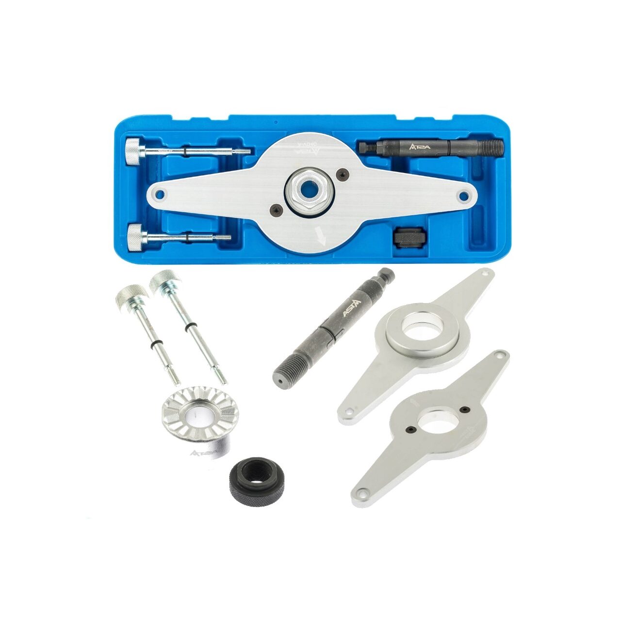 Setul permite demontarea și asamblarea amortizorului de vibrații și reglarea arborelui cotit. Kit esențial necesar pentru blocarea distribuției motorului atunci când amortizorul de vibrații trebuie îndepărtat.