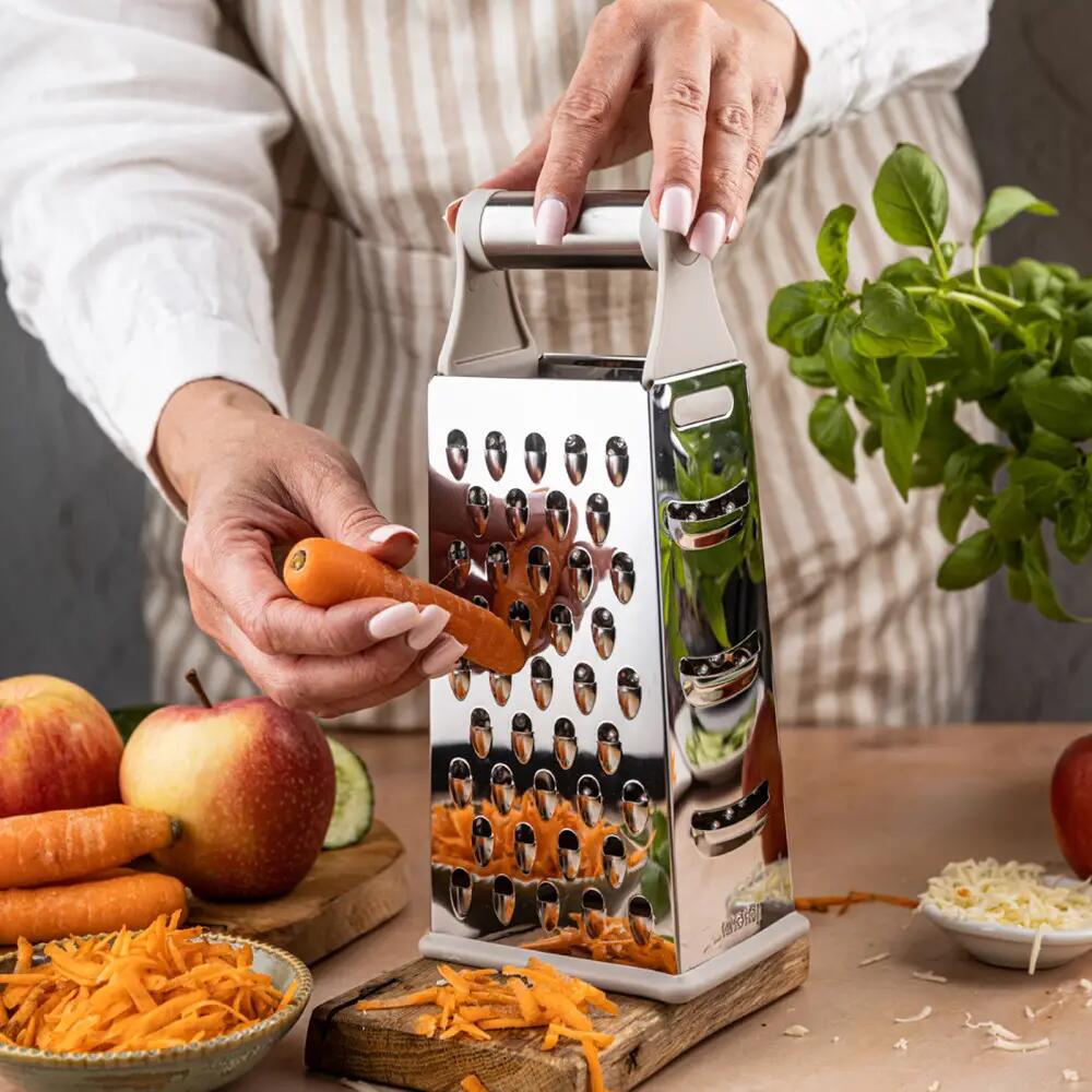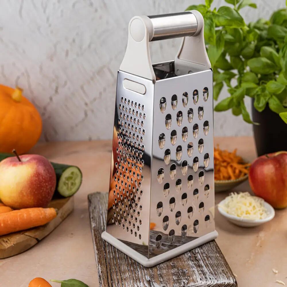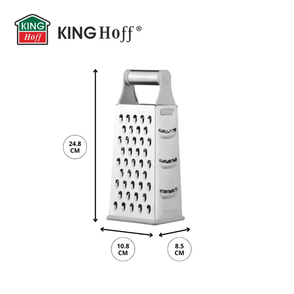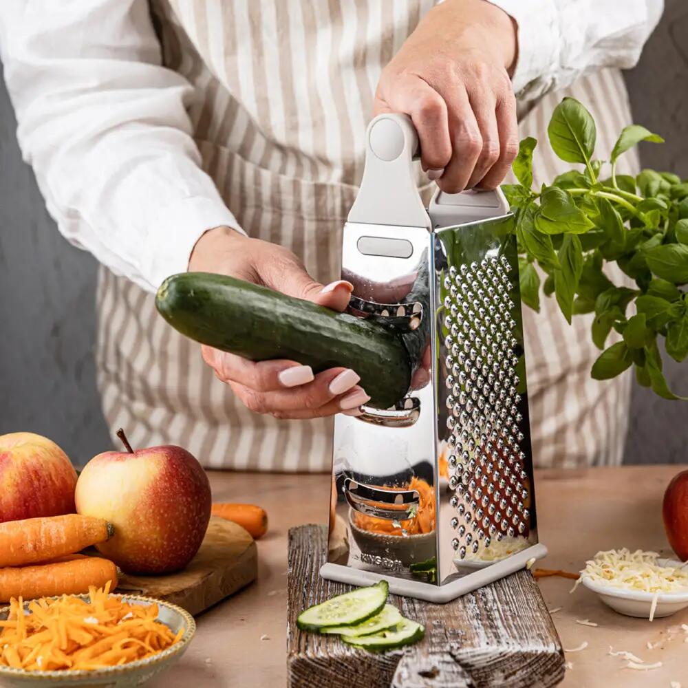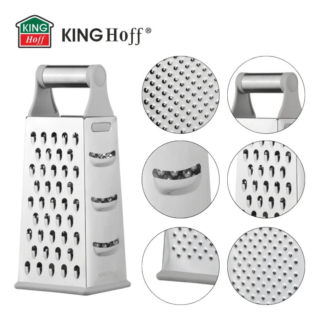 Răzătoarea KINGHoff KH-1989 este un accesoriu versatil care va fi util în orice bucătărie. Cu patru suprafețe diferite de măcinare, puteți prepara rapid legume, fructe sau brânzeturi în forma perfectă pentru gătit și servire. Construcția robustă din oțel inoxidabil și mânerul confortabil garantează confort pentru utilizarea zilnică.