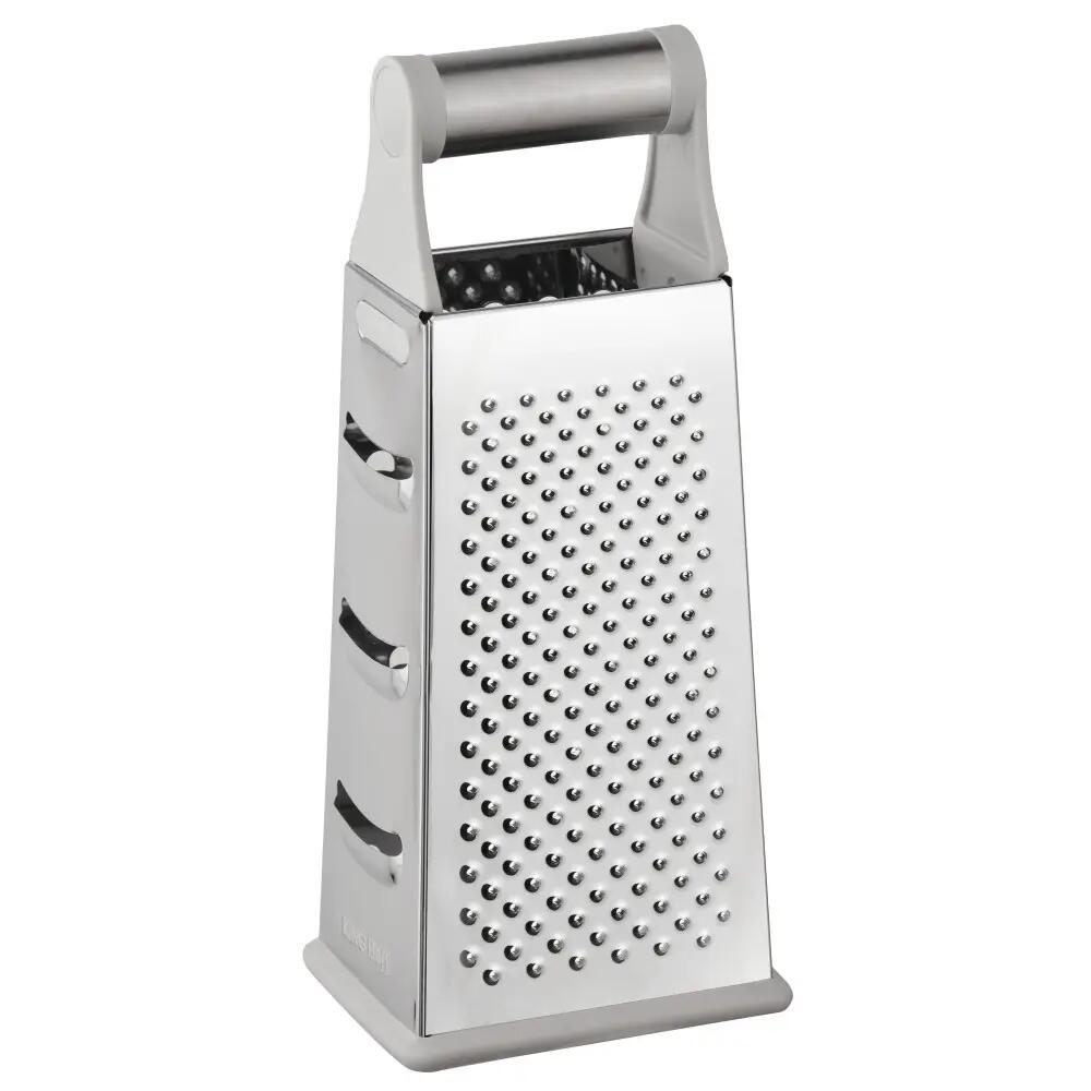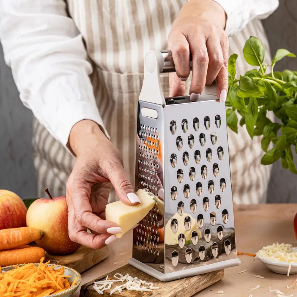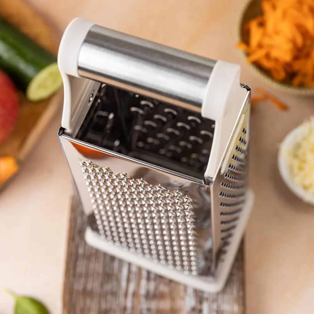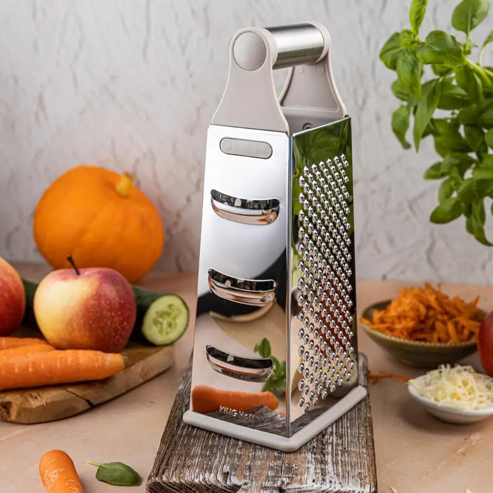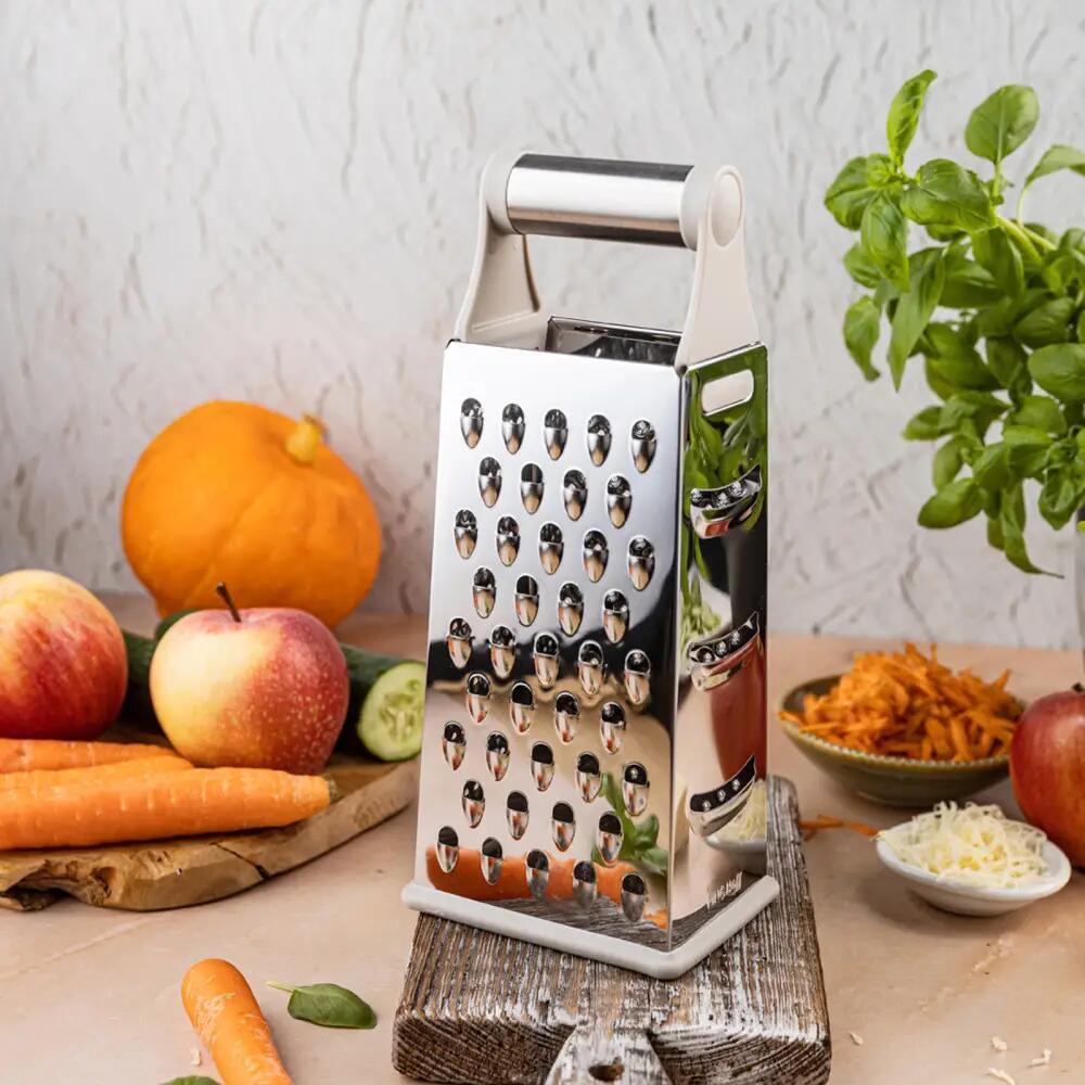 Răzătoarea KINGHoff KH-1989 este un accesoriu versatil care va fi util în orice bucătărie. Cu patru suprafețe diferite de măcinare, puteți prepara rapid legume, fructe sau brânzeturi în forma perfectă pentru gătit și servire. Construcția robustă din oțel inoxidabil și mânerul confortabil garantează confort pentru utilizarea zilnică.