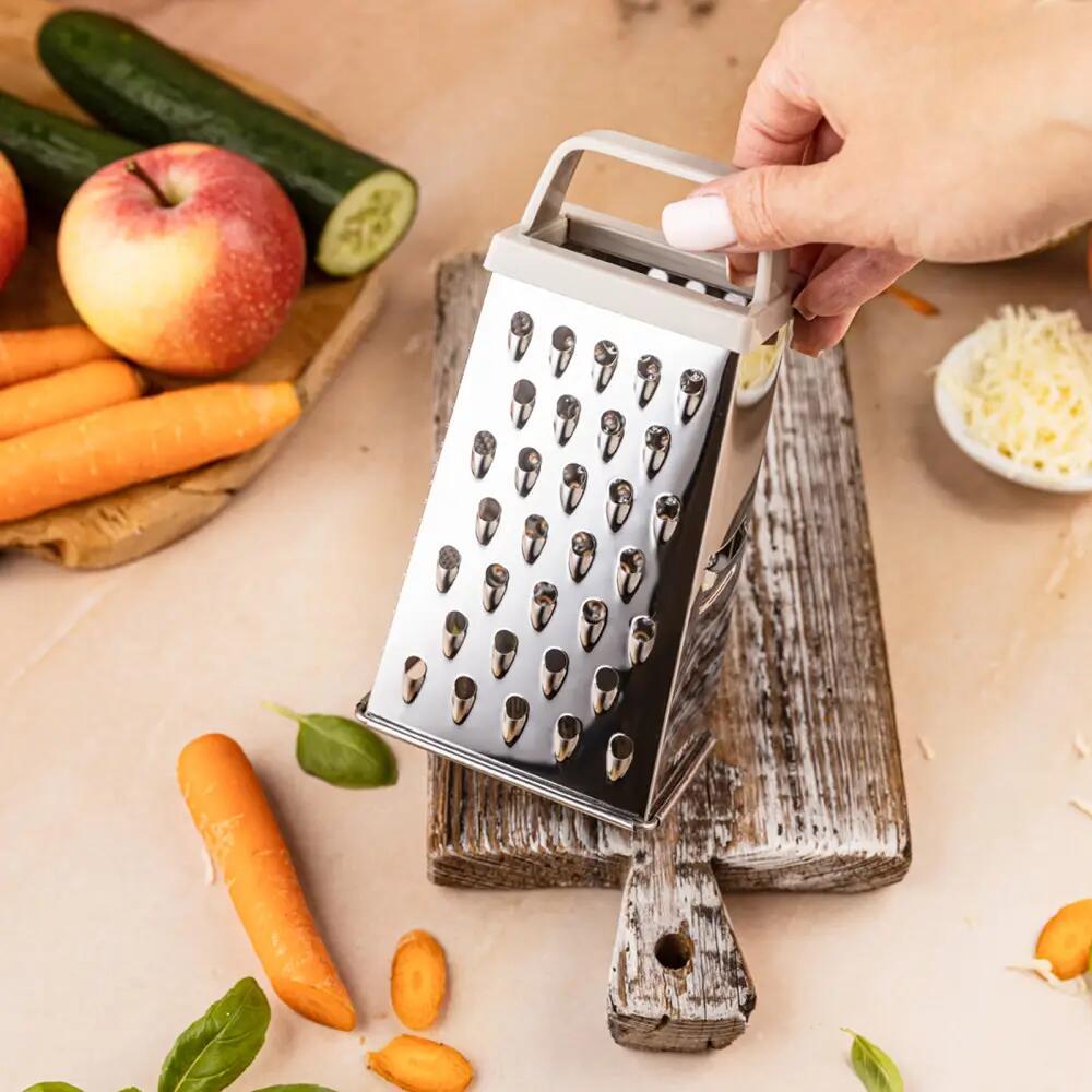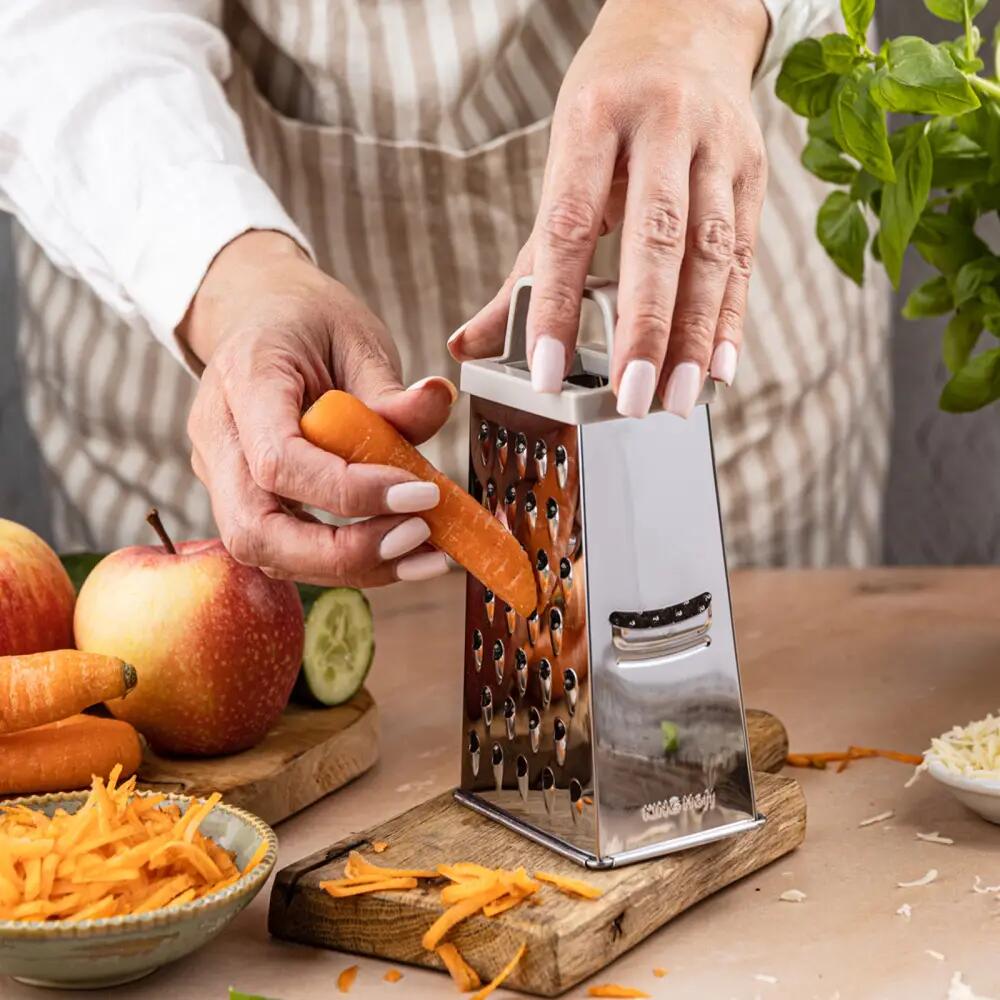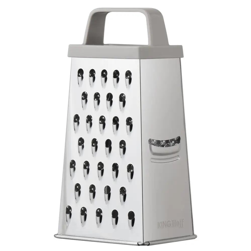 Răzătoarea de bucătărie KINGHoff KH-1986 este un accesoriu practic și durabil, care va funcționa bine atât în bucătăria de acasă, cât și în restaurante sau cantine. Cu patru suprafețe diferite de răzuire, puteți prepara cu ușurință legume, brânză, fructe sau ciocolată, ajustând efectul la nevoile dumneavoastră.