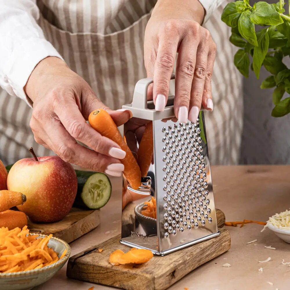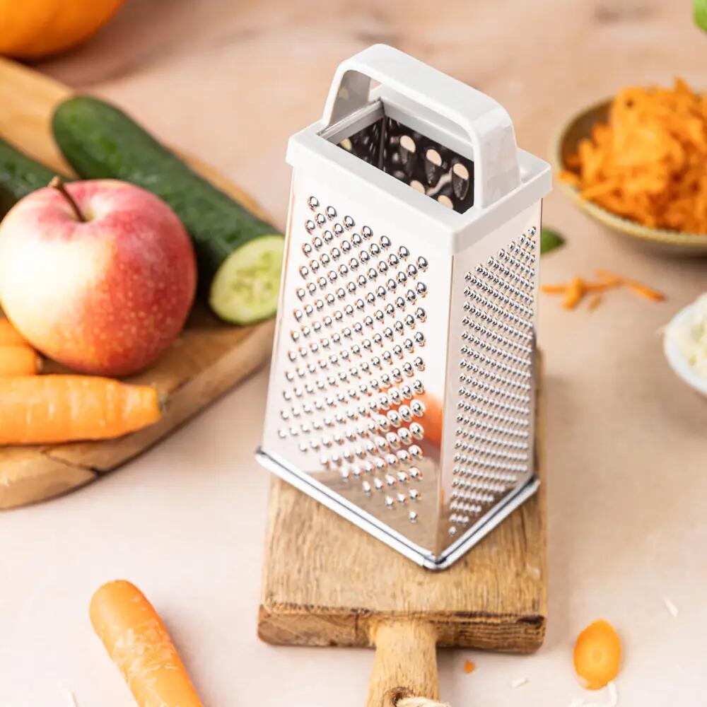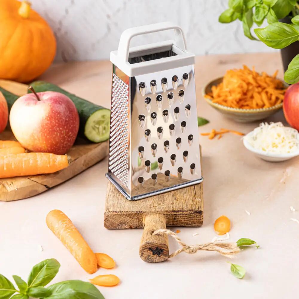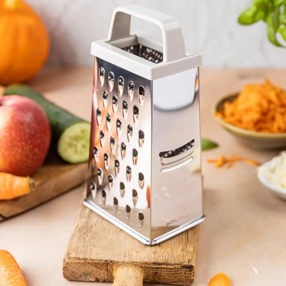 Răzătoarea de bucătărie KINGHoff KH-1986 este un accesoriu practic și durabil, care va funcționa bine atât în bucătăria de acasă, cât și în restaurante sau cantine. Cu patru suprafețe diferite de răzuire, puteți prepara cu ușurință legume, brânză, fructe sau ciocolată, ajustând efectul la nevoile dumneavoastră.