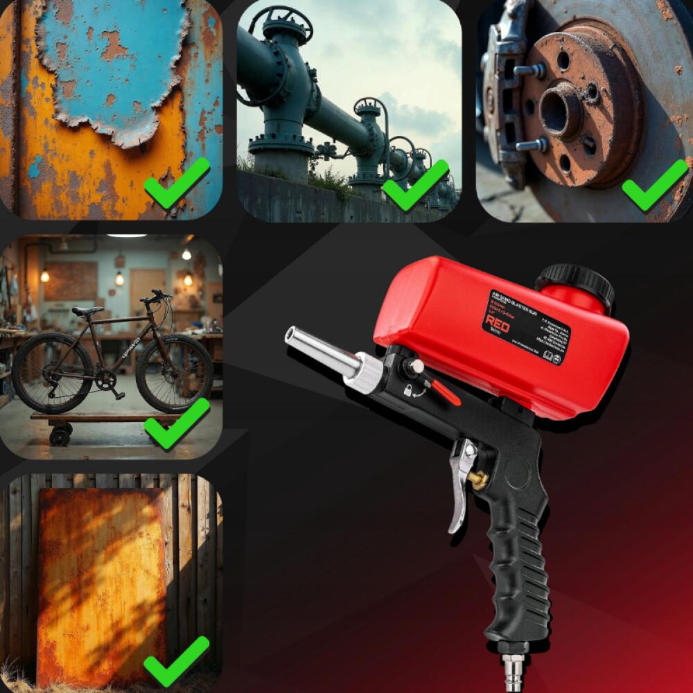 Pistolul este ideal pentru curățarea elementelor din oțel, îndepărtând eficient coroziunea, vopseaua veche care se decojește și suprafețele de sticlă mată.
