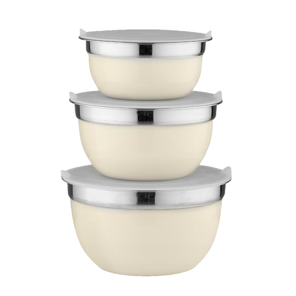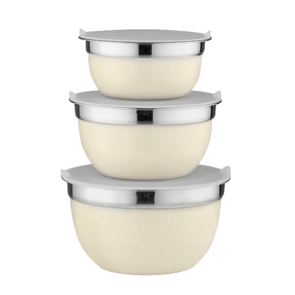 Un set practic de 3 boluri din otel inoxidabil cu capace care cu siguranta vor deveni de incredere in timpul diverselor lupte in bucatarie.
