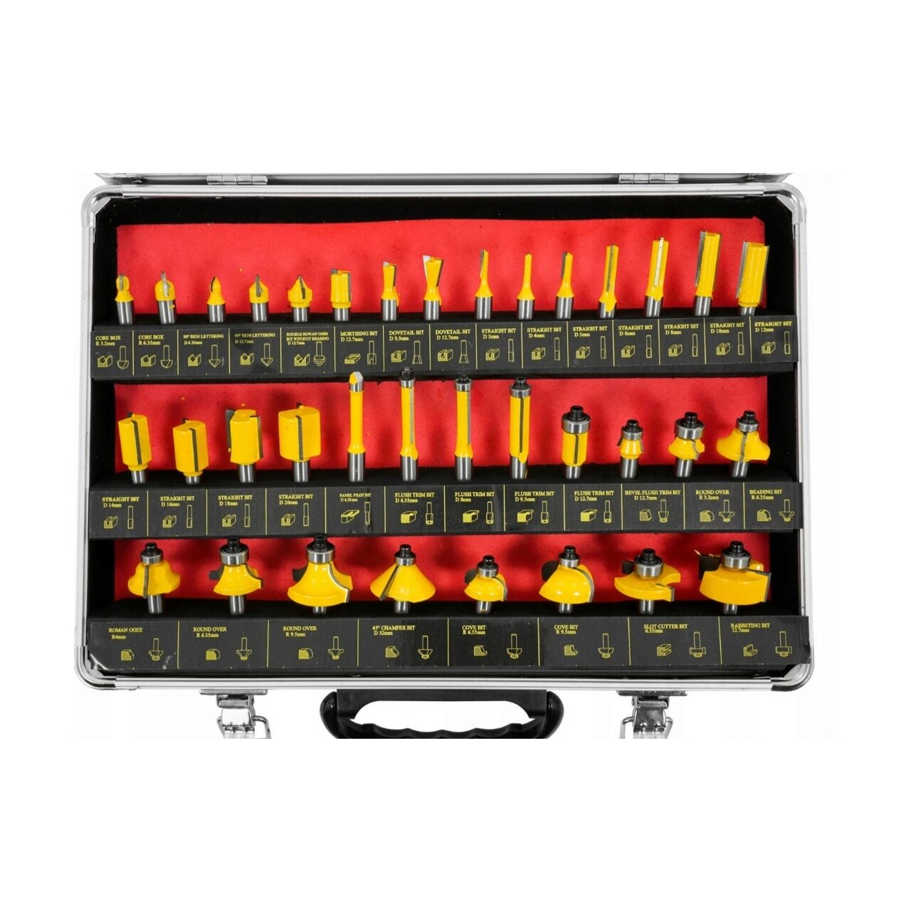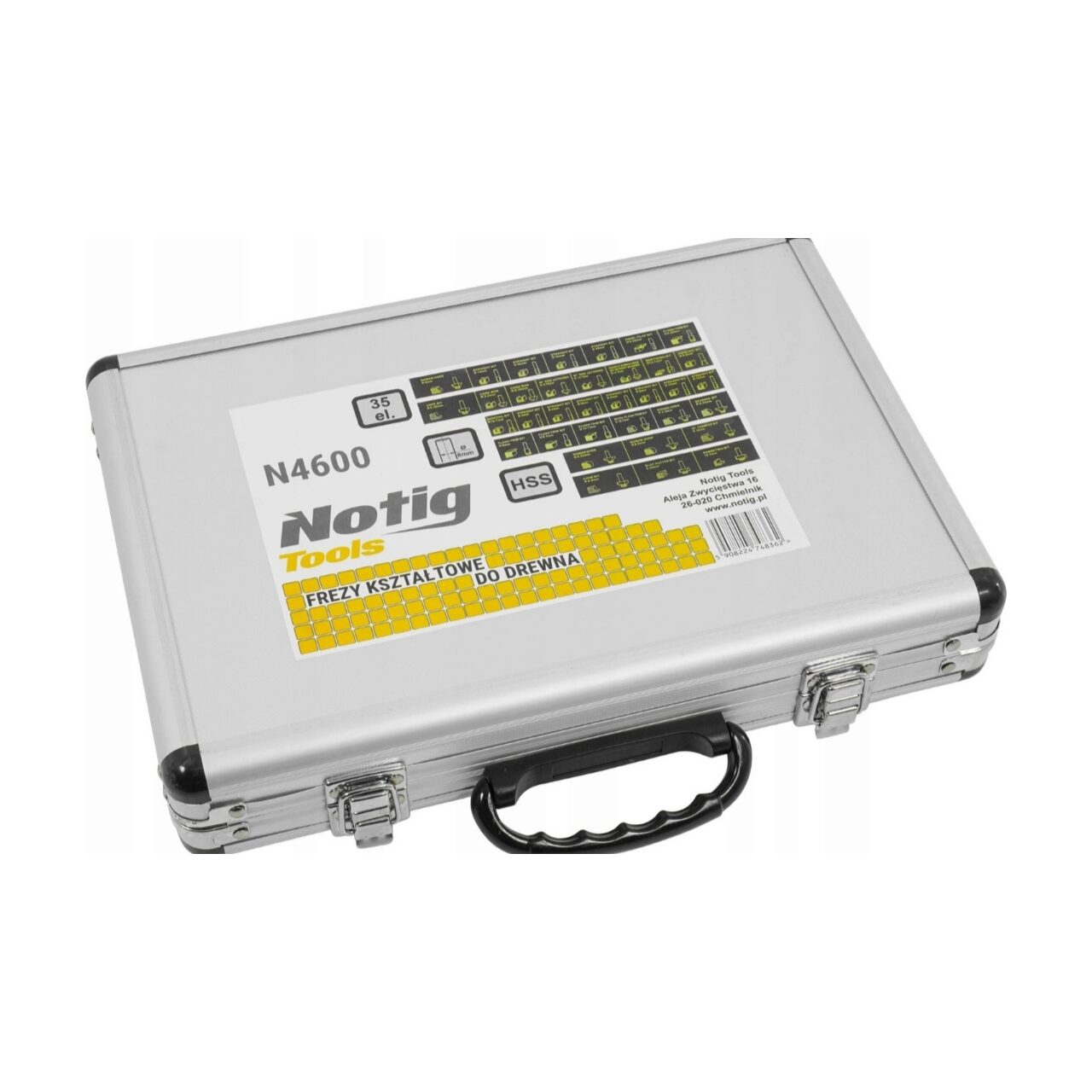 Set 35 de freze pentru lemn , in cutie de aluminiu, compatibile cu freza electrica Oberfreza cu prindere de 8mm Notig