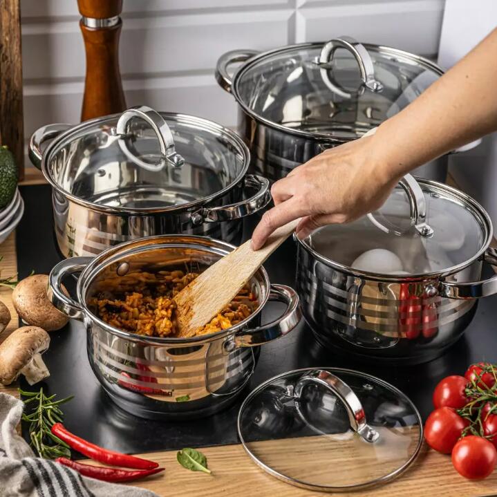 Oțelul inoxidabil crom-nichel din care este realizat întregul set este durabil și de lungă durată. Materialul folosit nu este doar cel mai bun posibil, dar arată și grozav, este excepțional de ușor de curățat și are proprietăți antibacteriene. Vasele din acest set au un fund acu-termic feromagnetic cu 5 straturi cu un strat de aluminiu care garantează o distribuție și stocare excelentă a căldurii. Toate oalele pot fi folosite pe toate tipurile de aragaz, inclusiv pe aragazul cu inducție . Mânere nituite (lustruite). Pe interiorul fiecărei oale există o cană practică de măsurat .