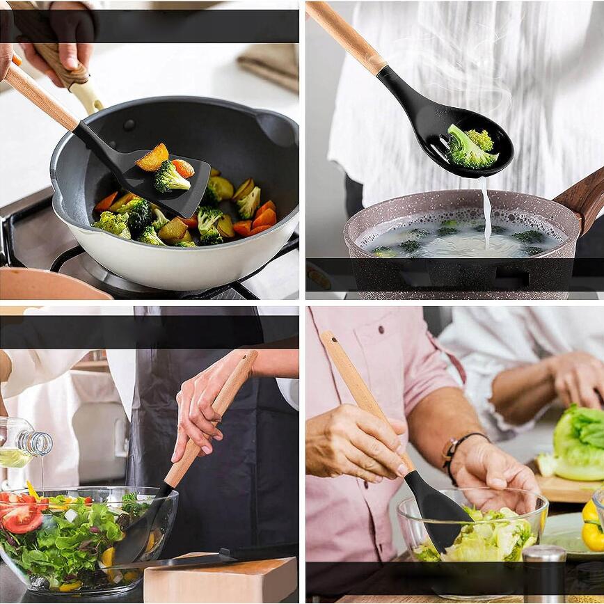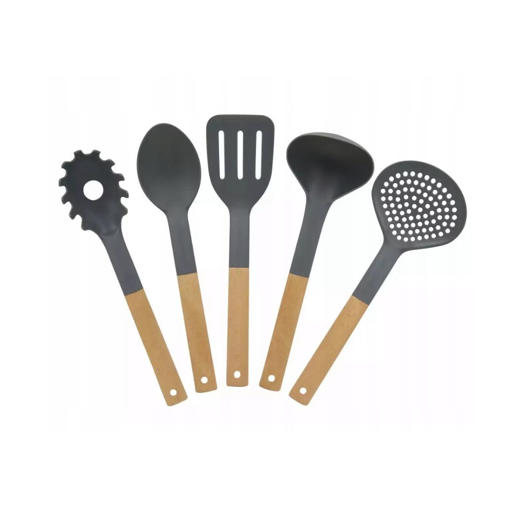 Un set de ustensile de bucătărie din lemn și nailon termoplastic.
