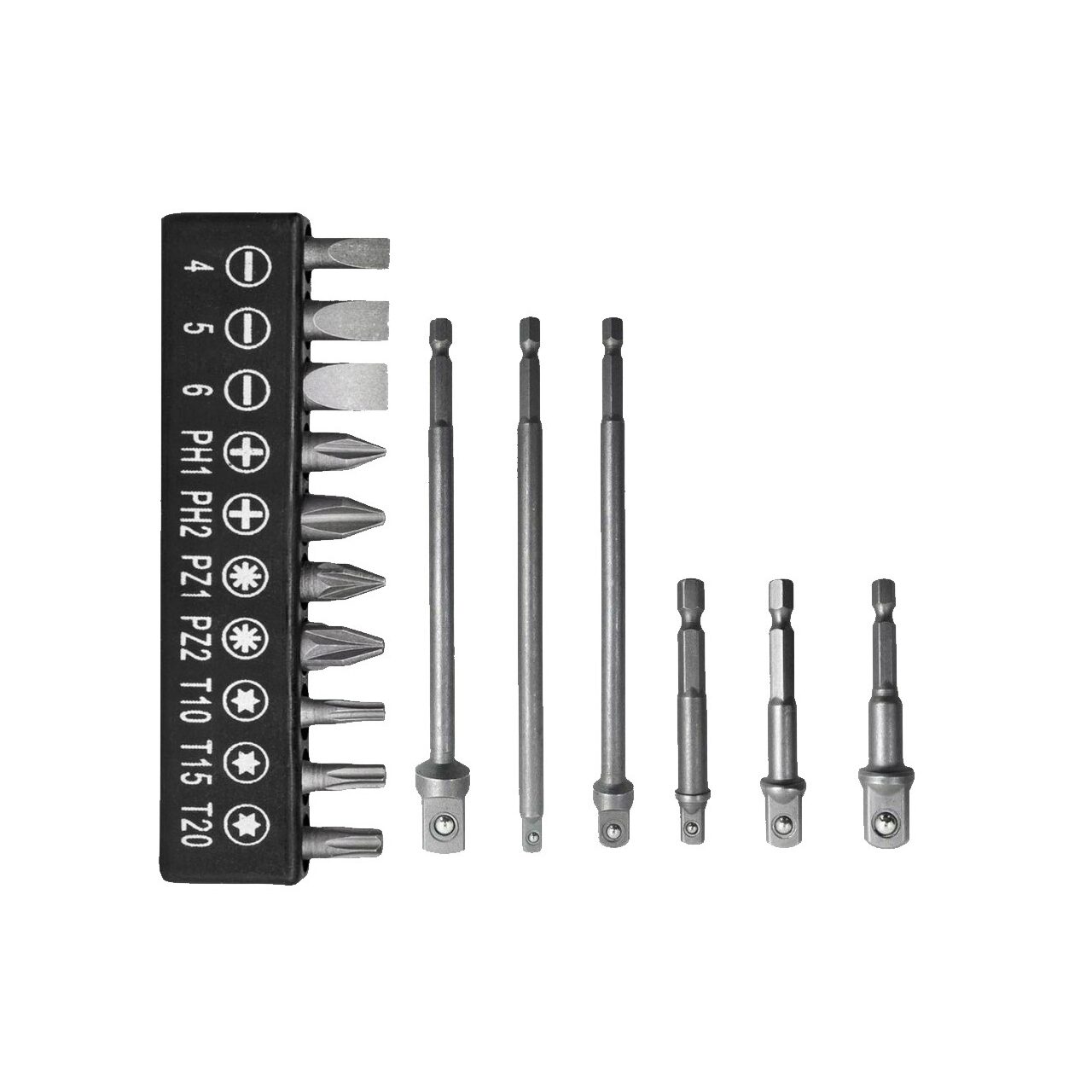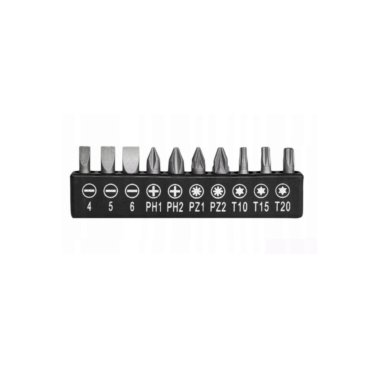 Un set de 10 biți profesionali de 25 mm 1/4" într-un set cu 3 extensii și 3 adaptoare pentru o șurubelniță. Potrivit pentru ateliere auto, servicii, precum și pentru uz casnic și bricolaj.