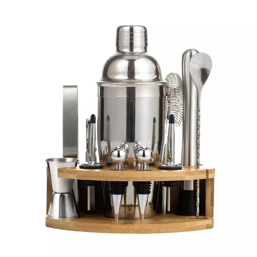 Un set solid, durabil, greu, de înaltă calitate de accesorii pentru bar pentru prepararea de cocktailuri, din oțel inoxidabil (inox).