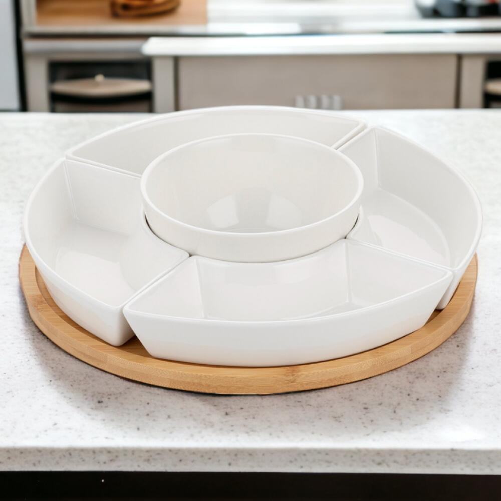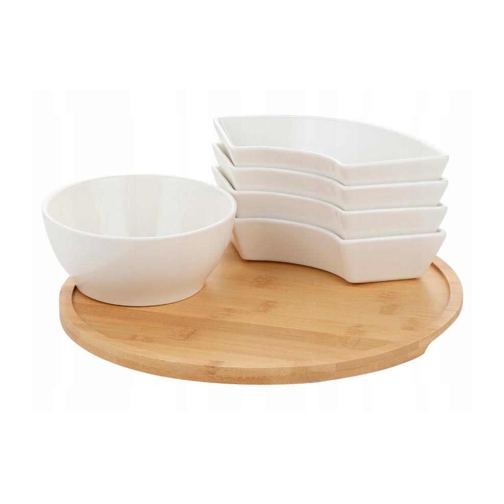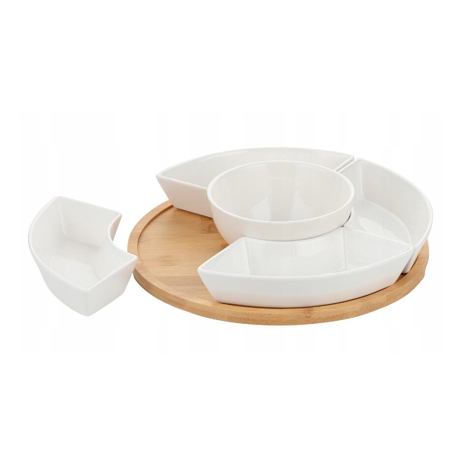 Setul include boluri pentru gustări și un suport din bambus.