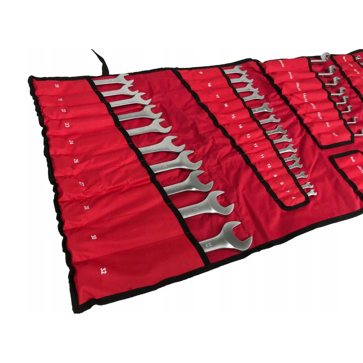 Chei cu cap deschis de foarte înaltă calitate din oțel crom-vanadiu. Proiectat pentru utilizare atât acasă, cât și într-un atelier profesional. Îndeplinesc standardele DIN 3113 Tastele au un finisaj estetic satinat. Întregul lucru este ambalat într-o carcasă roll-up convenabilă, astfel încât ocupă puțin spațiu. Husa este realizata dintr-un material foarte rezistent si durabil, iar gaurile din colturile superioare ii permit agatarea pe perete.