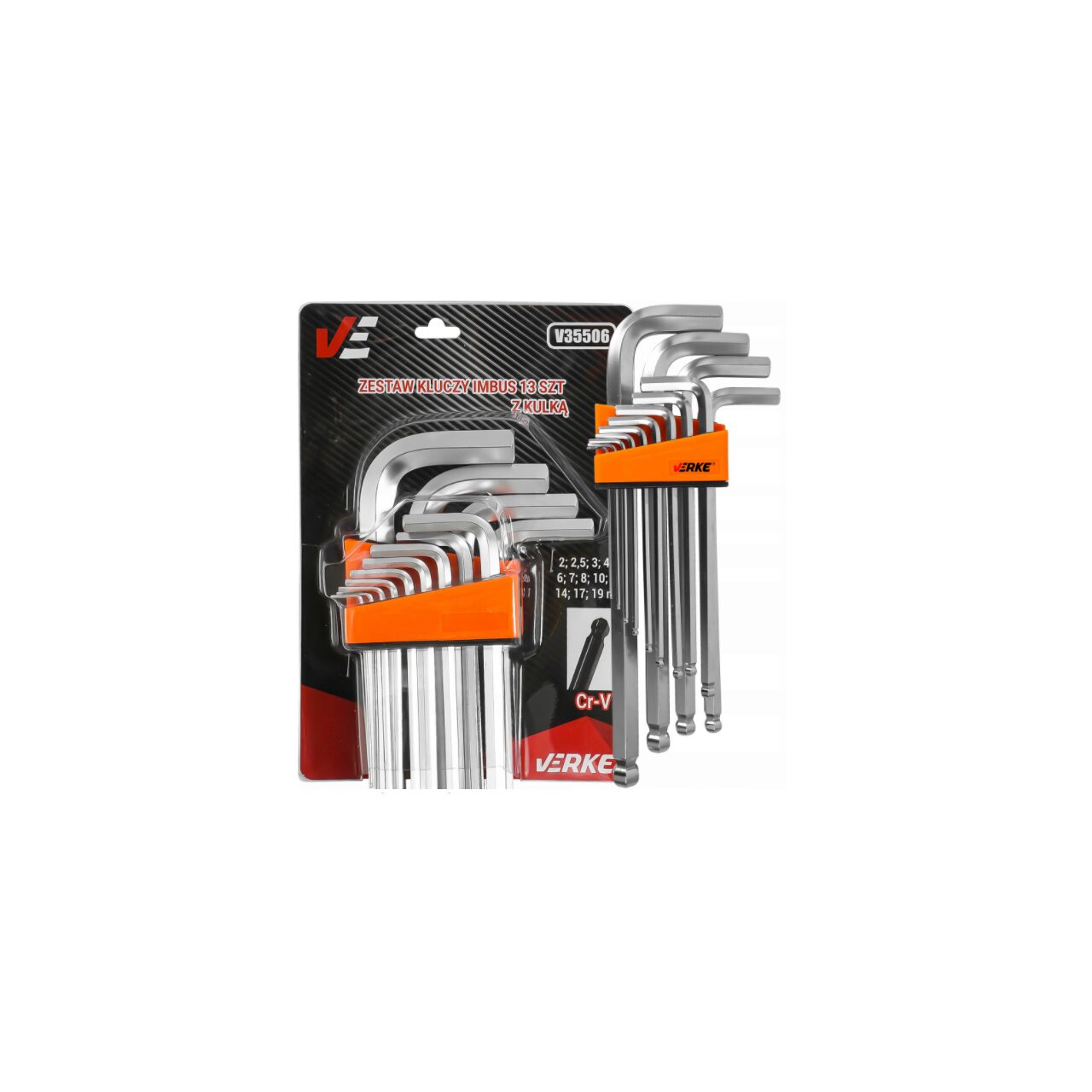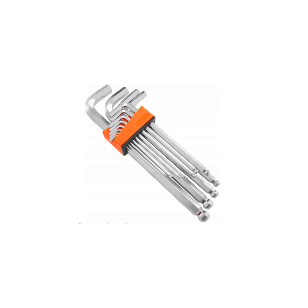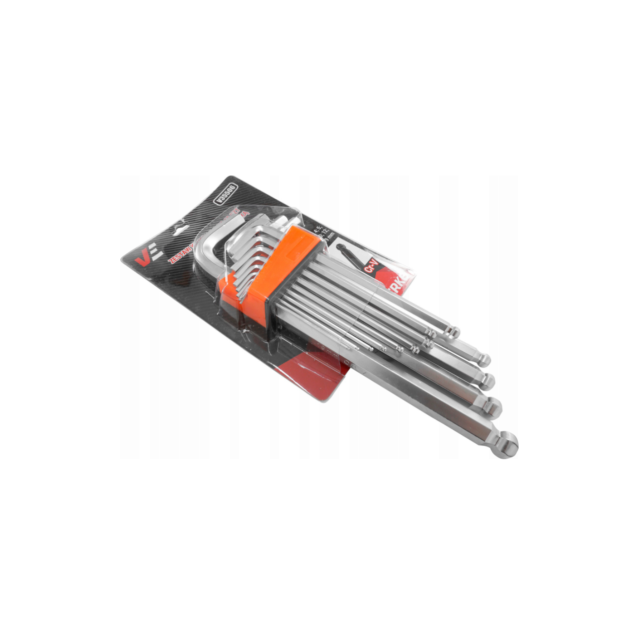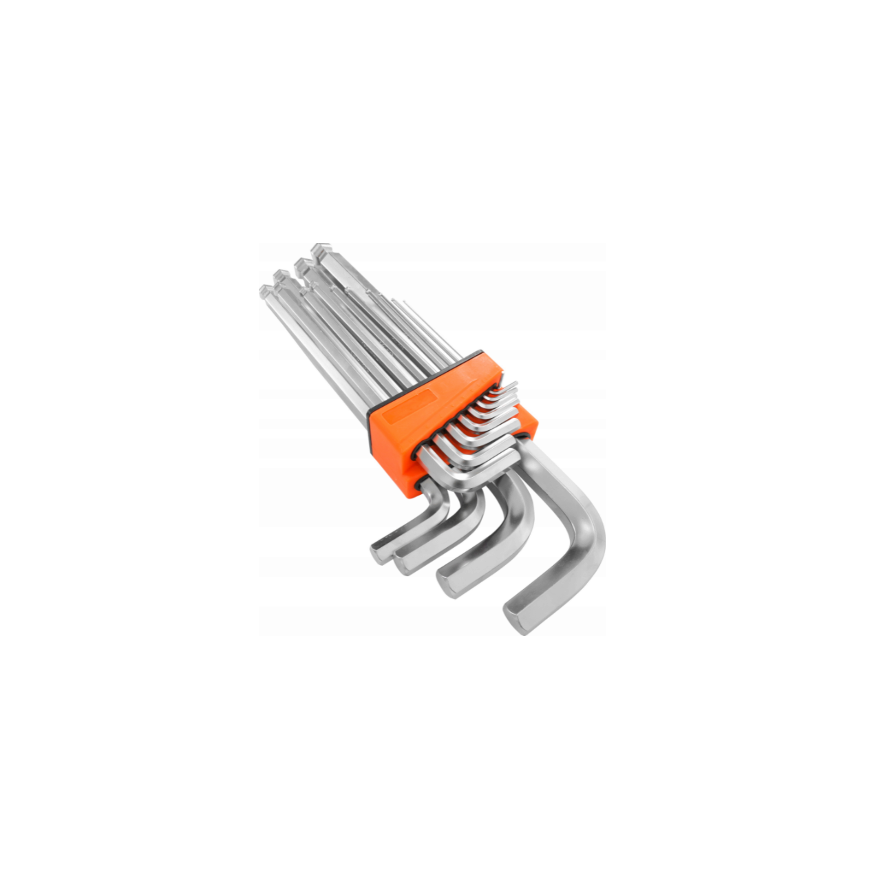 Setul perfect de chei cu bitul hexagonal IMBUS. Setul este ambalat într-un cuier din plastic practic și la îndemână, ceea ce facilitează găsirea dimensiunii potrivite a cheii. Chei realizate din oțel CrV crom vanadiu de înaltă calitate, caracterizate prin rezistență și elasticitate. Vârful cheii are o minge care vă permite să lucrați în unghi.