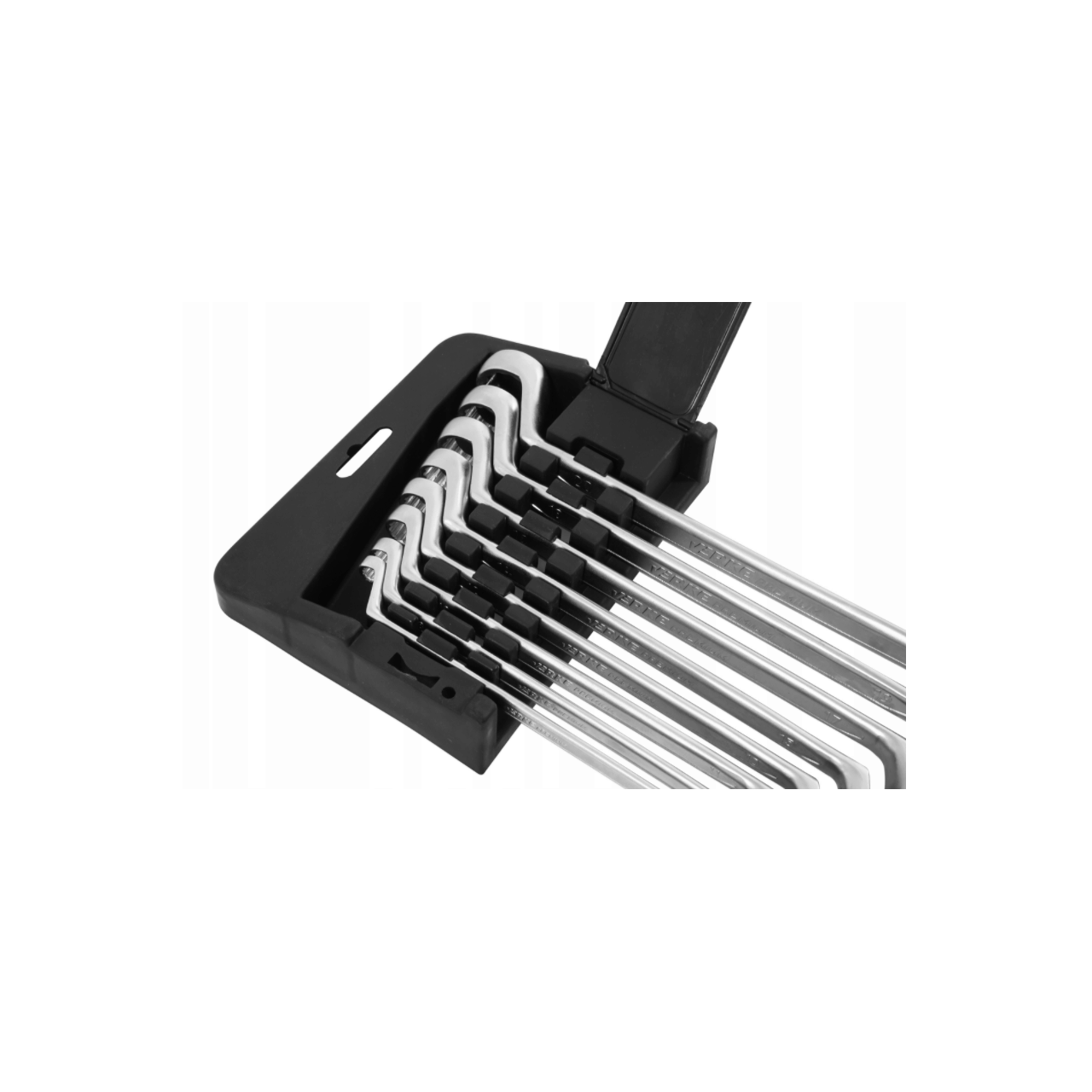 Cheile inelare curbate de înaltă calitate din oțel crom-vanadiu îndeplinesc standardele DIN 838. Toate ambalate într-o cutie de plastic cu umeraș.