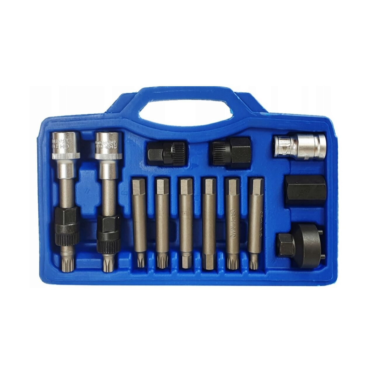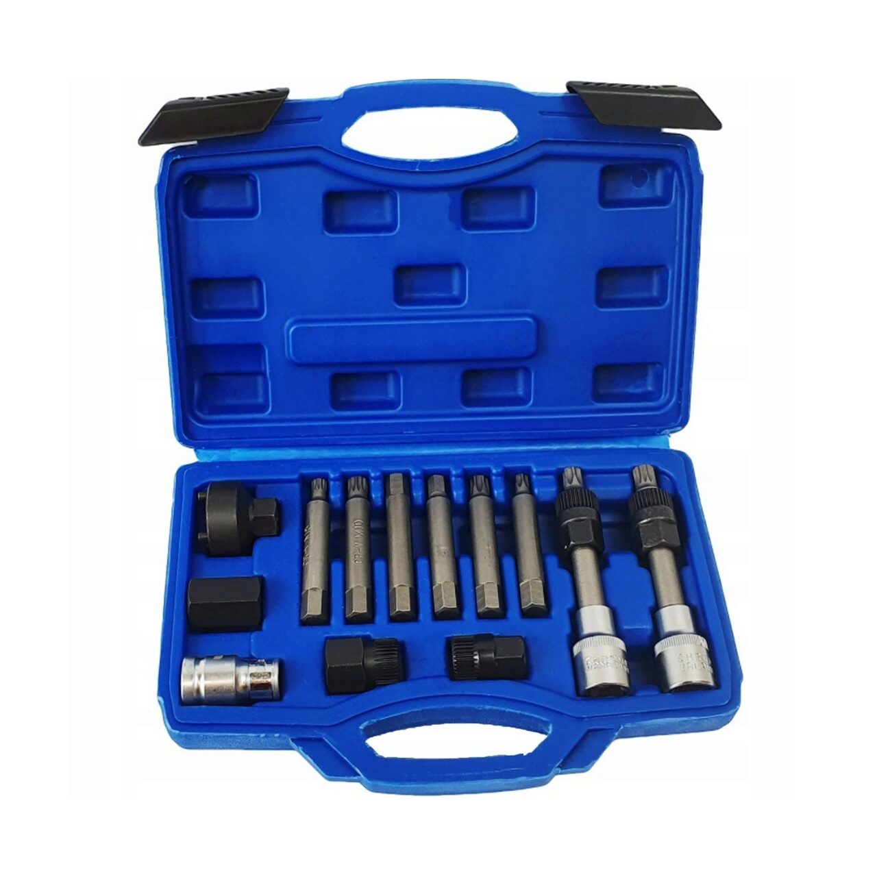 Un set bogat de chei pentru asamblarea și dezasamblarea alternatoarelor cu ambreiaj Bosch, Magneti Marelli. Potrivit pentru mașinile următoarelor mărci: Audi, BMW, Fiat, Ford, Mercedes, Opel, Porsche, Renault, Peugeot, Seat, Skoda, Volvo, VW și alte mărci. Cheile sunt fabricate din oțel CrV crom-vanadiu de înaltă calitate, ceea ce le face durabile și rezistente la deteriorare. Cheile vă permit să deșurubați simultan șurubul de montare al scripetei (folosind bitul corespunzător) și să țineți scripetele cu ambreiajul (folosind o priză specializată).