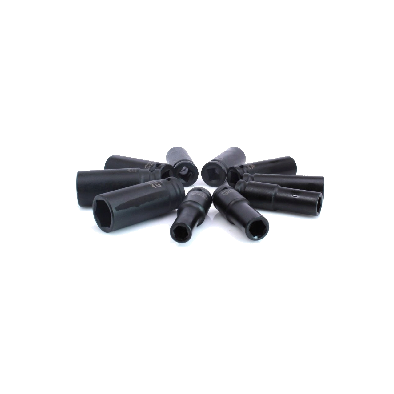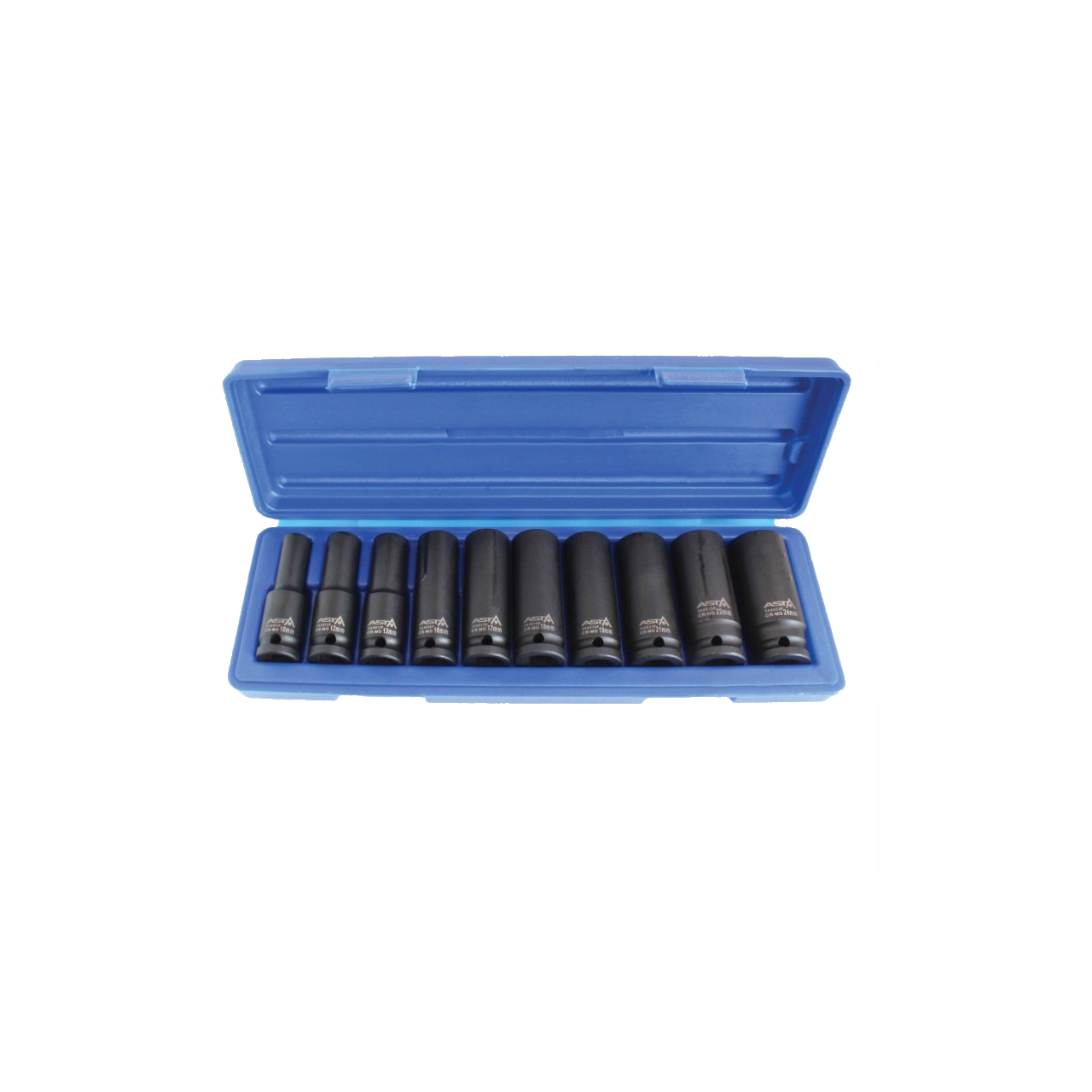 Setul include 10 bucăți de chei de impact de 1/2" și o carcasă.