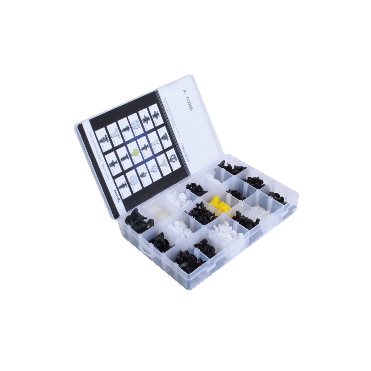 Un set de 18 tipuri diferite de cleme, inclusiv cleme de fixare, cleme de reținere, cleme pentru șipci.
