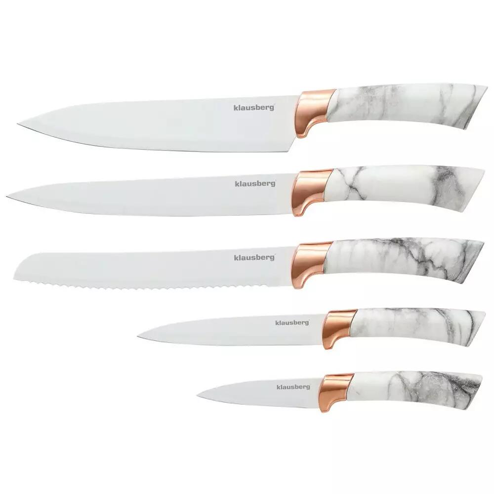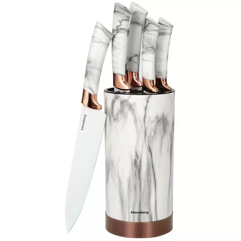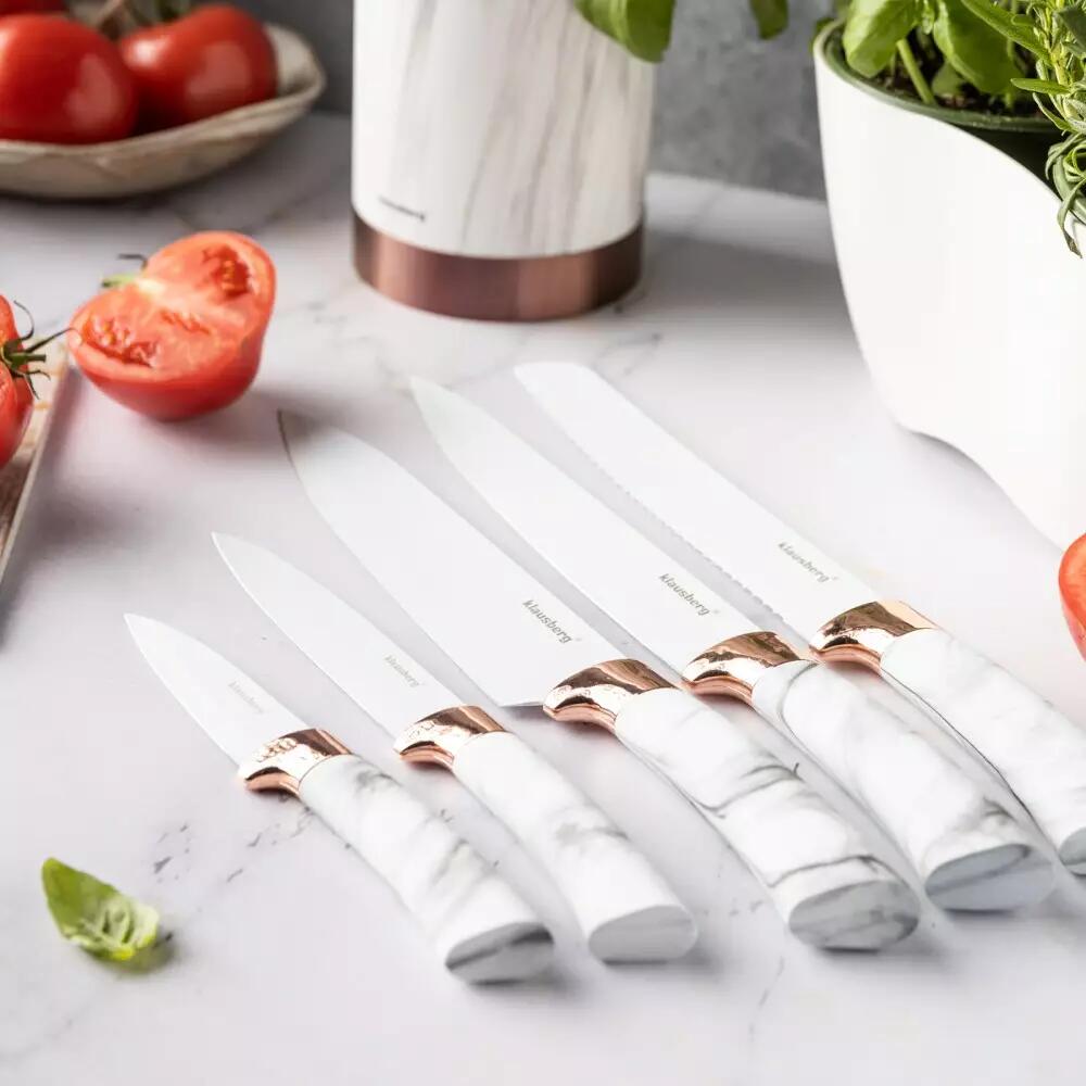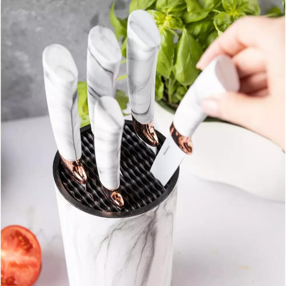 Set cutite din inox cu suport, 6 elemente, alb cu model maro, Kinghoff