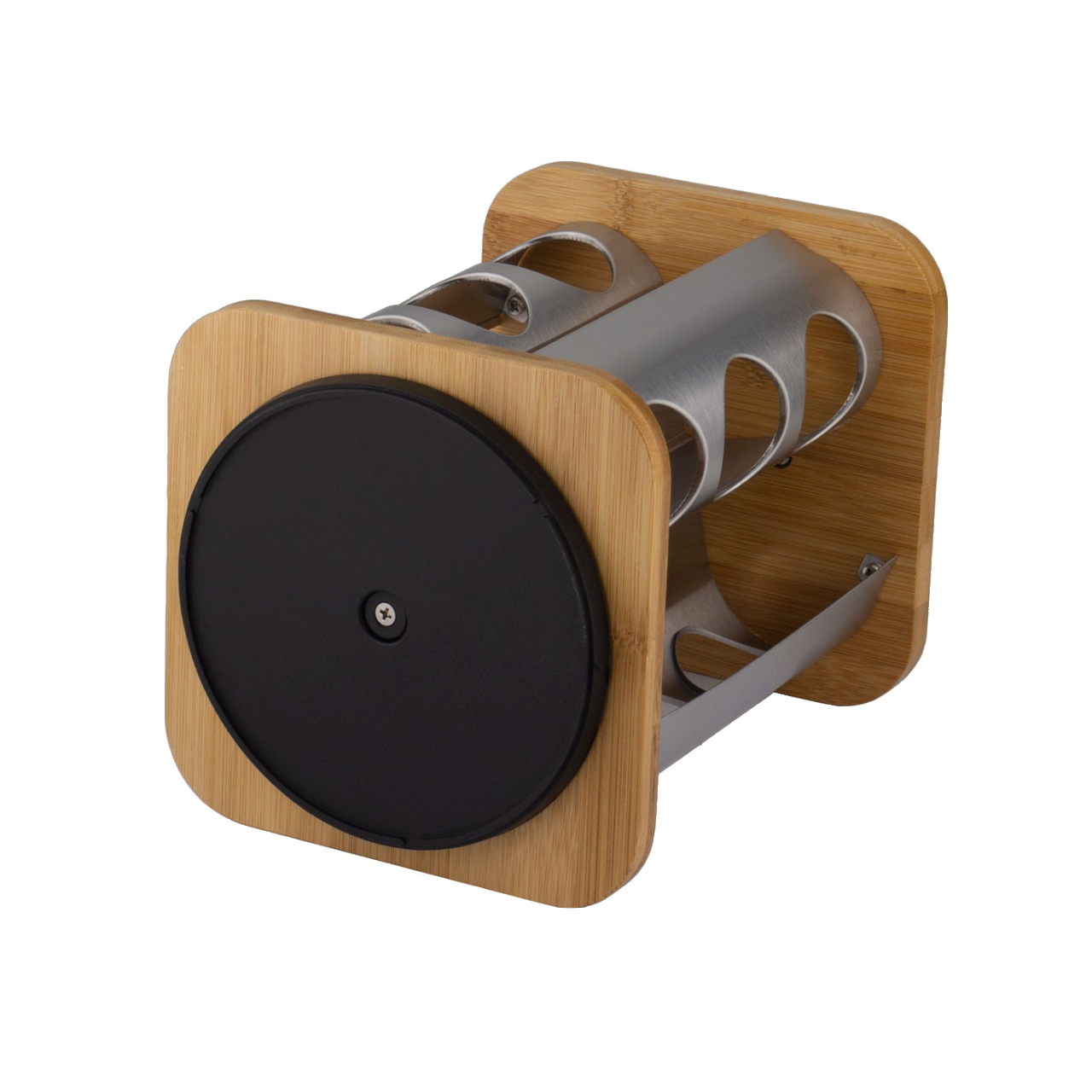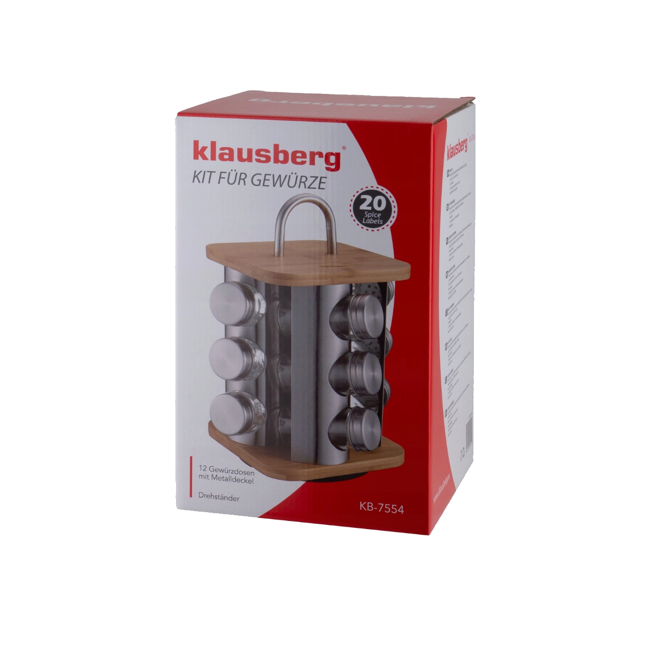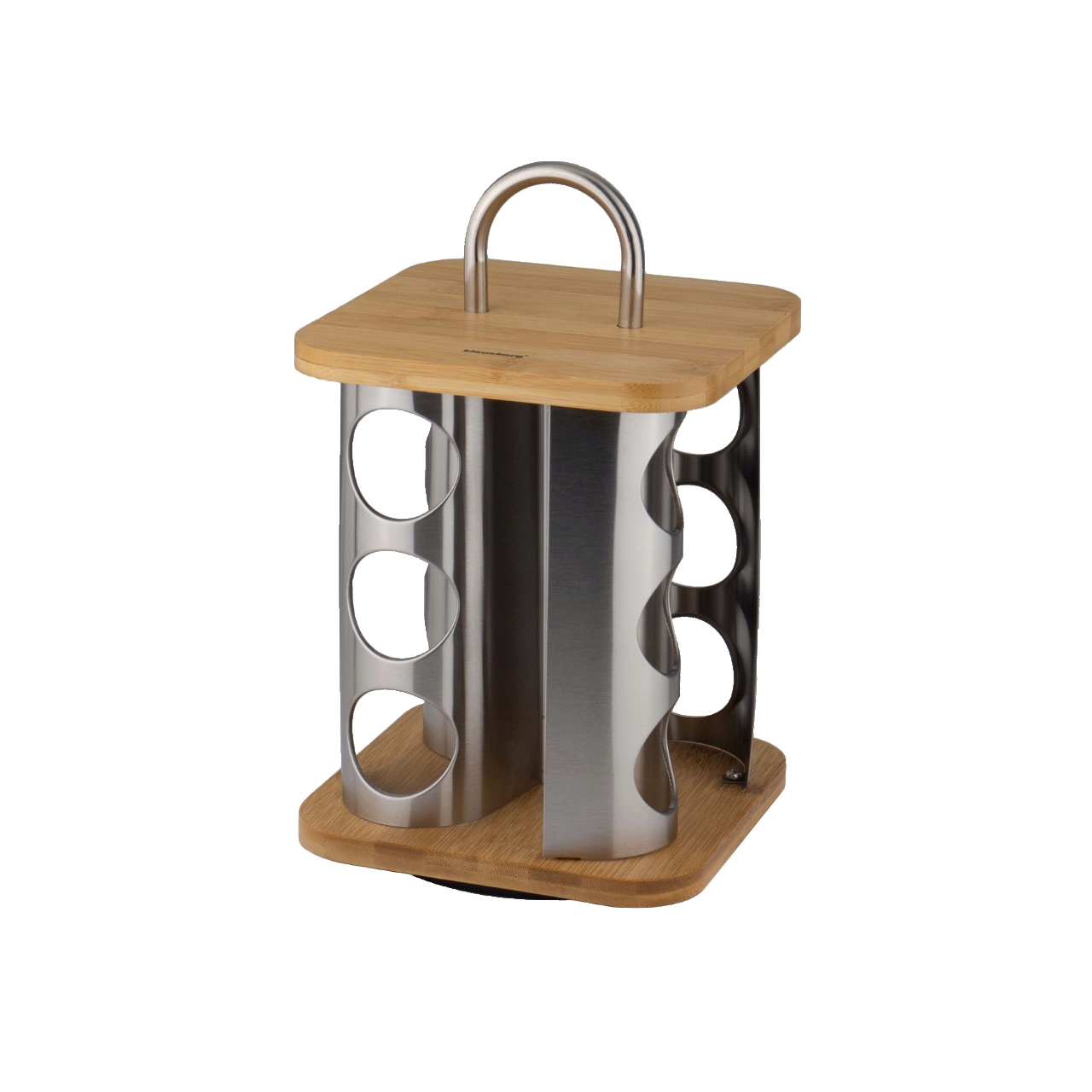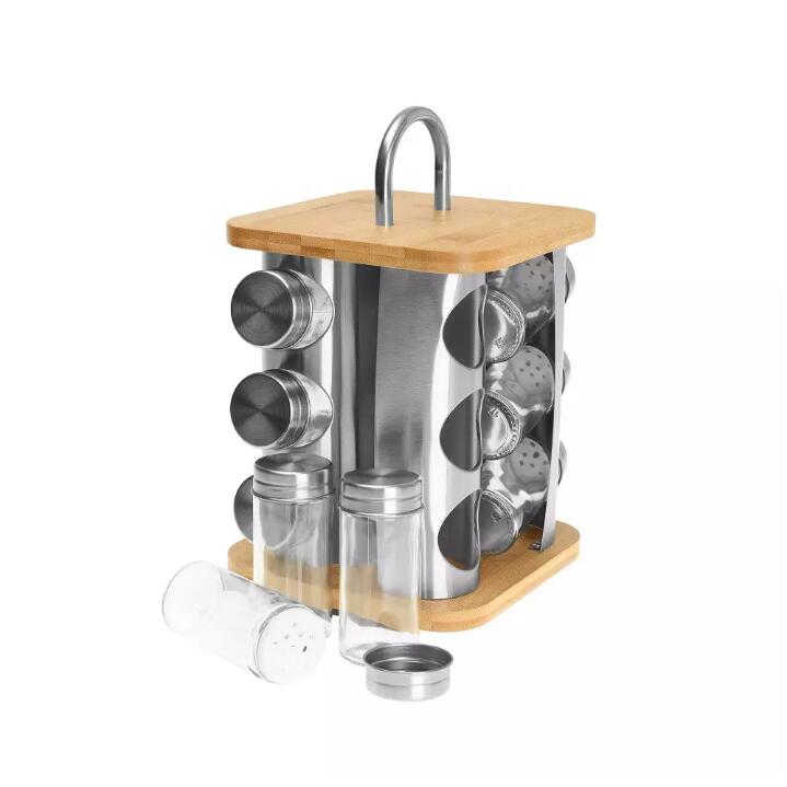 Un set de 16 recipiente din sticla pe un suport rotativ din bambus, din otel.
