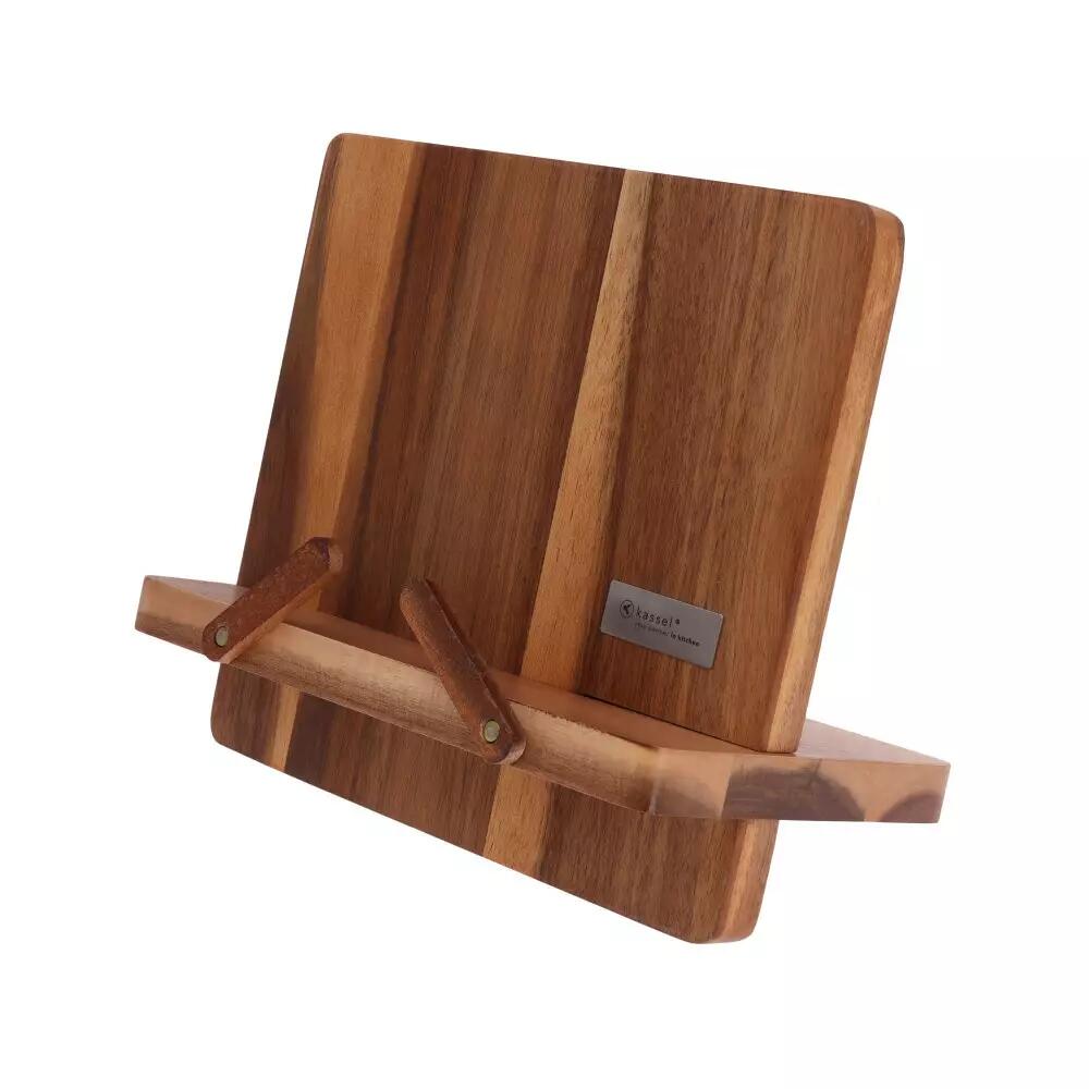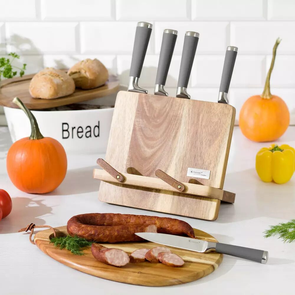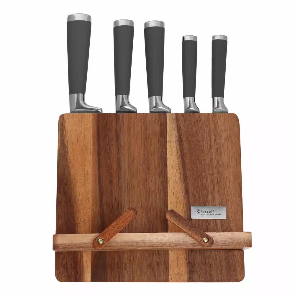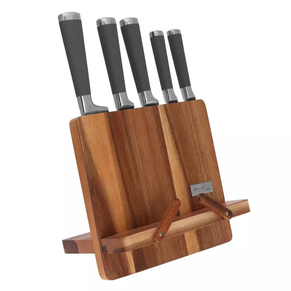 Cuțitele sunt așezate într-un bloc din lemn de salcâm cu spațiu pentru o carte sau tabletă.
