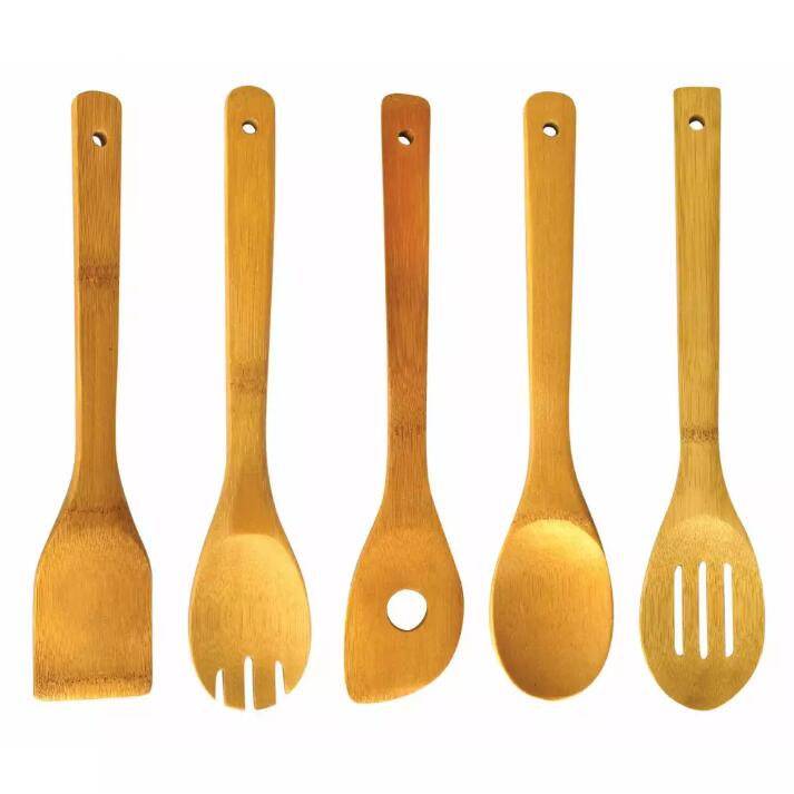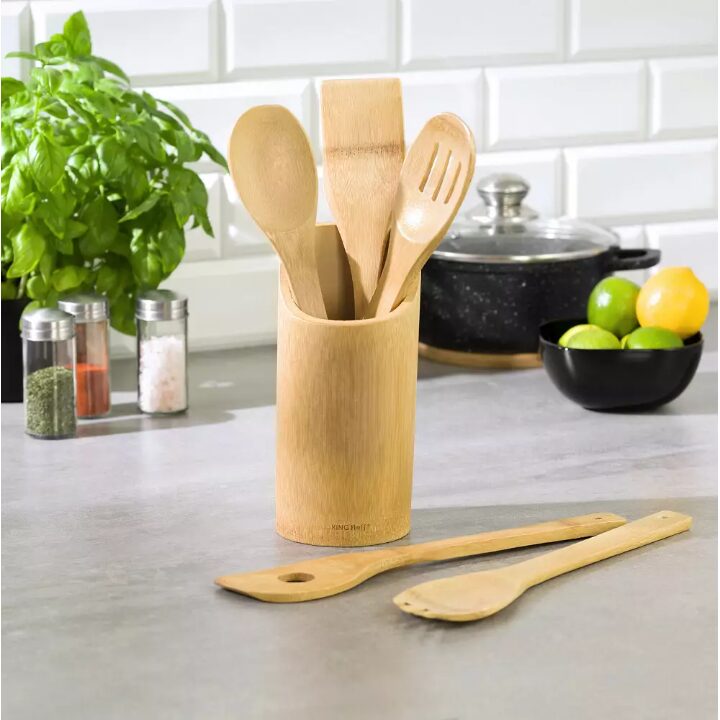 Un set practic de cinci accesorii de bucătărie din lemn natural de bambus.