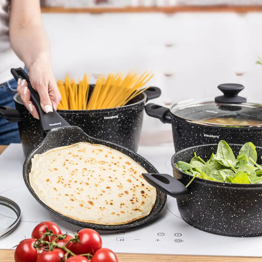 Set de 7 piese, oale si tigaie pentru clatite, aluminiu turnat si strat antiaderent marmorat, negru, Klausberg