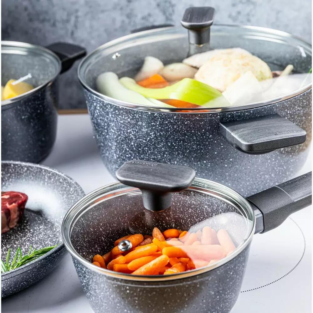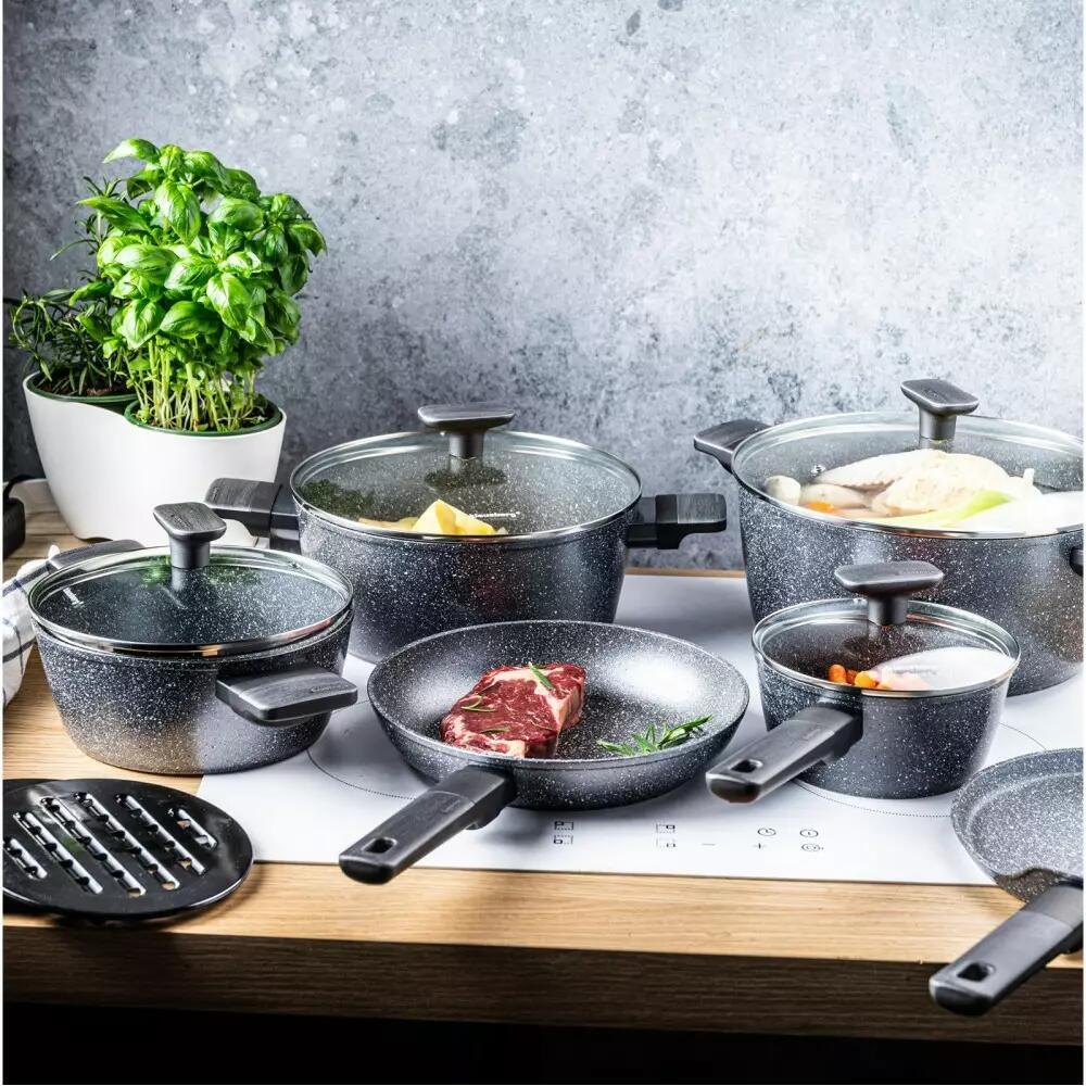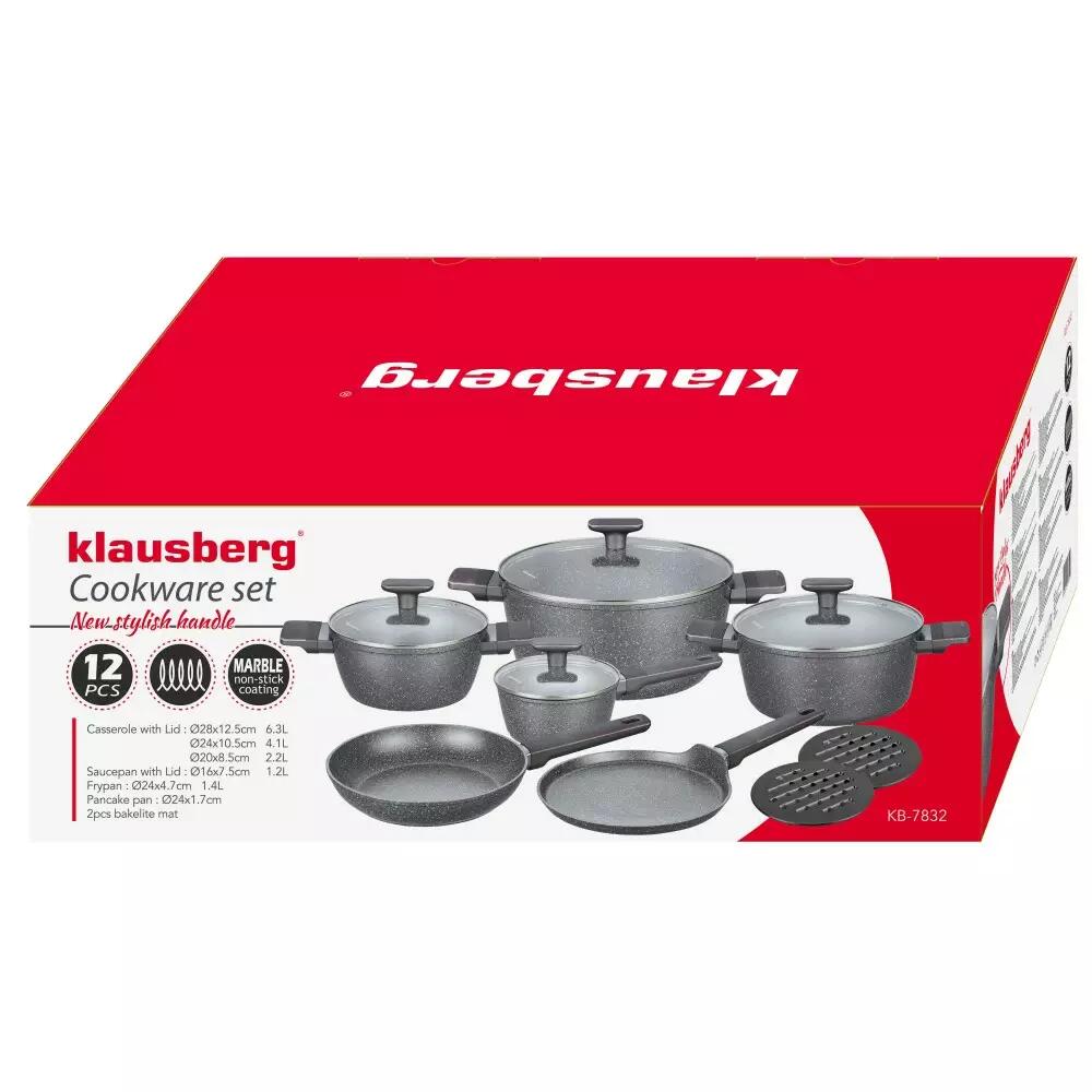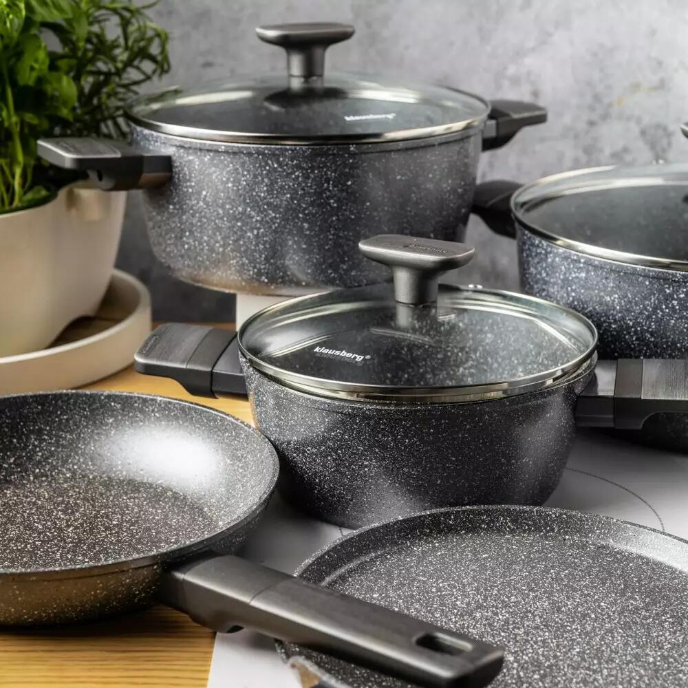 Setul de 12 oale și tigăi de la KLAUSBERG este combinația perfectă între funcționalitate, estetică și soluții tehnologice moderne. Modelul KB-7832 în culoarea marmură gri a fost creat pentru gătitul de zi cu zi în orice gospodărie. Datorită varietății de dimensiuni și a manoperei de înaltă calitate, acest set va îndeplini cerințele bucătărilor amatori și profesioniști, aducând confort și eleganță oricărei bucătării.