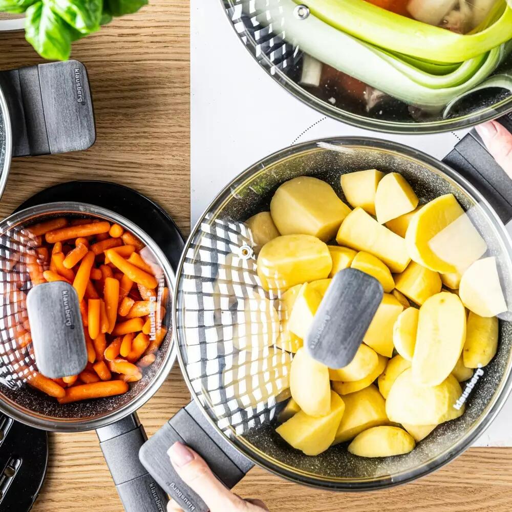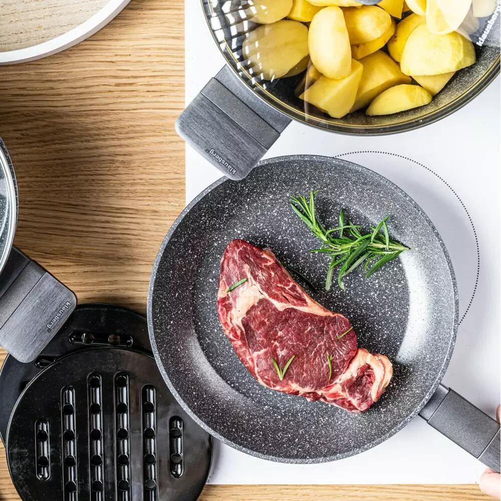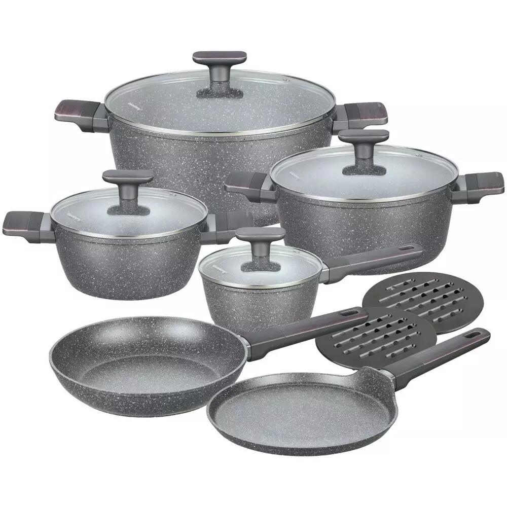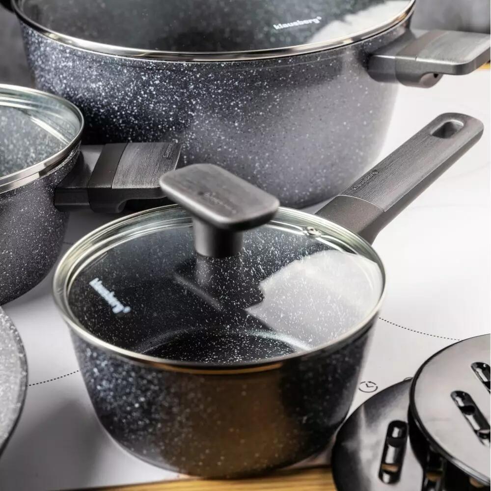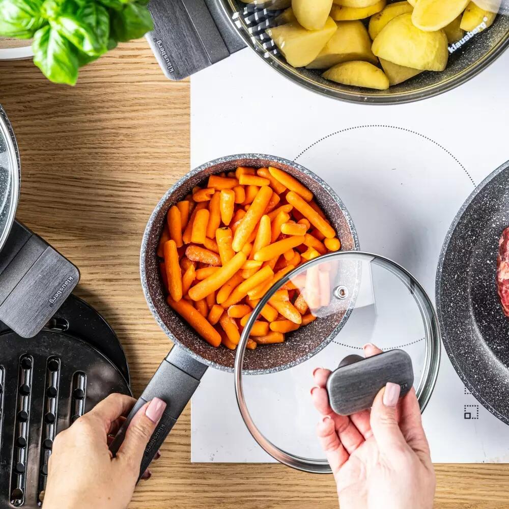 Setul de 12 oale și tigăi de la KLAUSBERG este combinația perfectă între funcționalitate, estetică și soluții tehnologice moderne. Modelul KB-7832 în culoarea marmură gri a fost creat pentru gătitul de zi cu zi în orice gospodărie. Datorită varietății de dimensiuni și a manoperei de înaltă calitate, acest set va îndeplini cerințele bucătărilor amatori și profesioniști, aducând confort și eleganță oricărei bucătării.