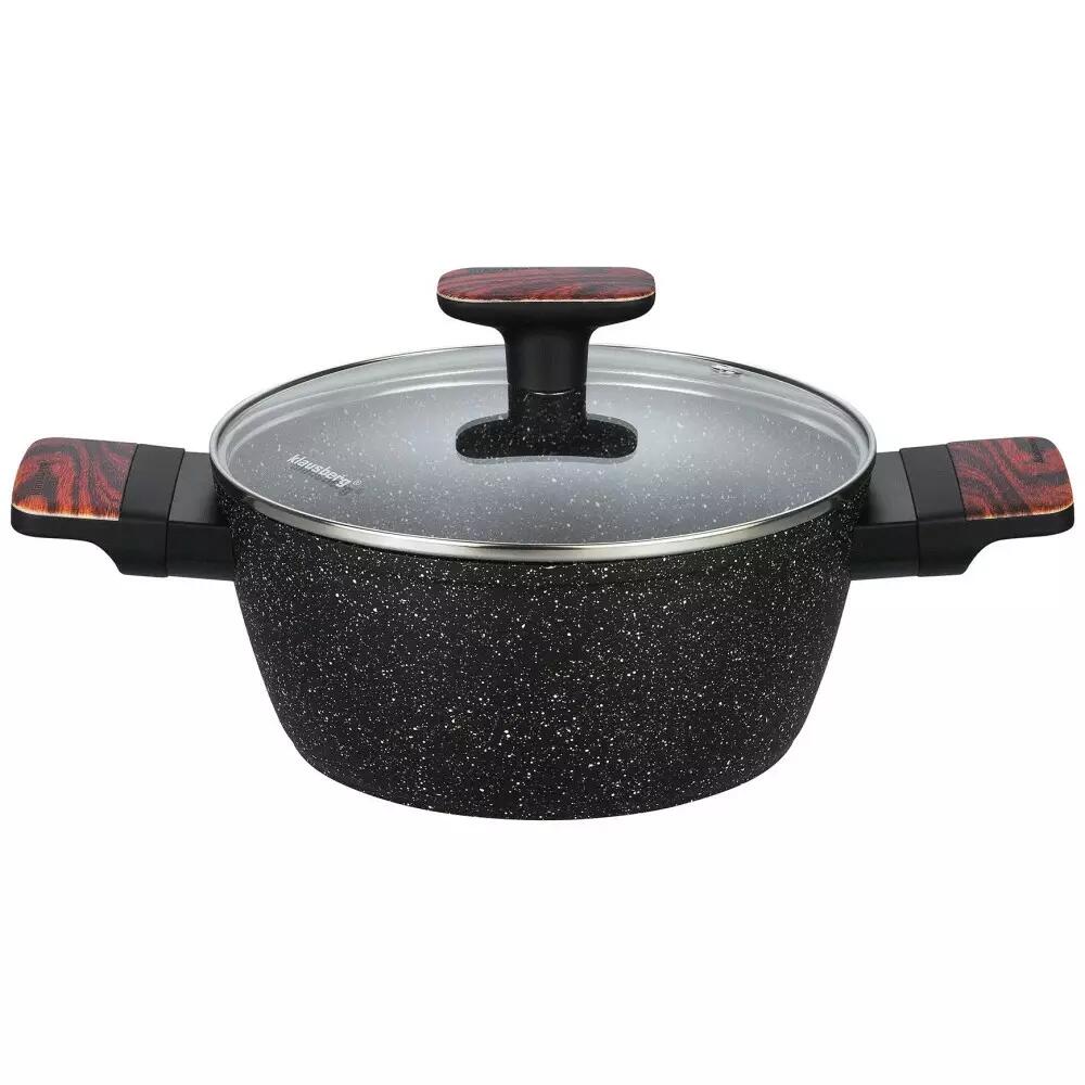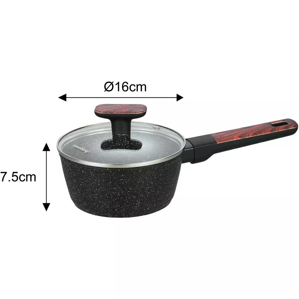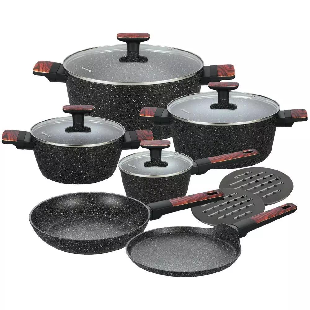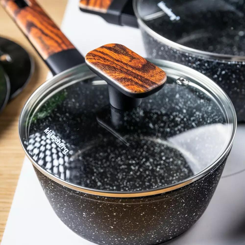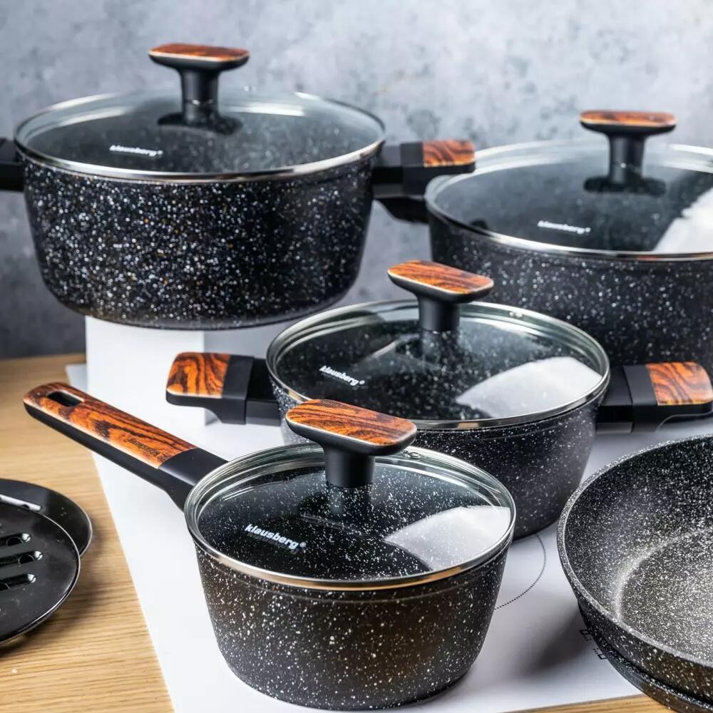 Set oale si tigai, 12 bucati, acoperit antiaderent, negru cu manere din lemn maro, Klausberg