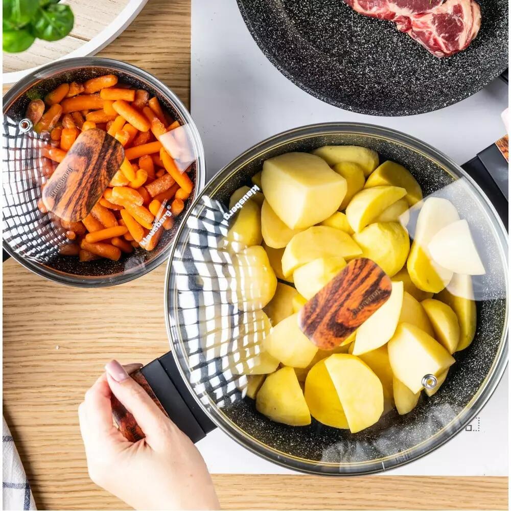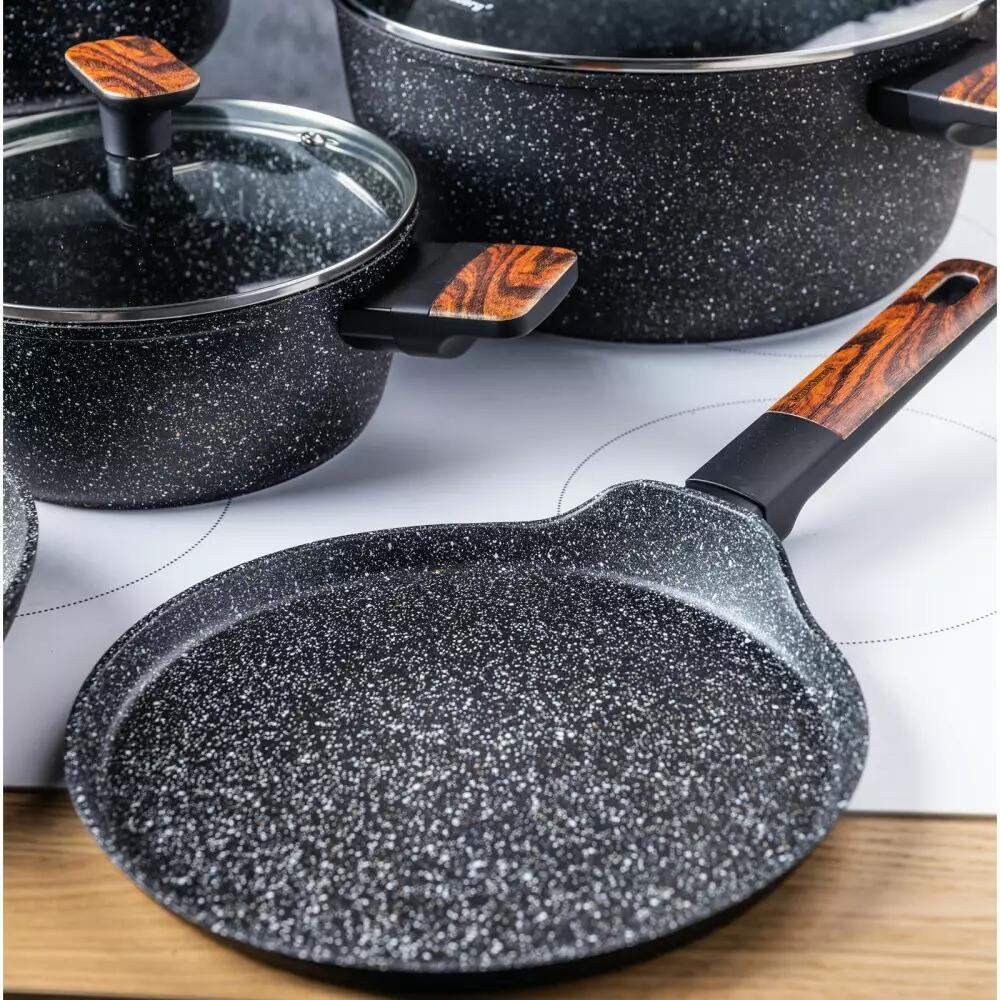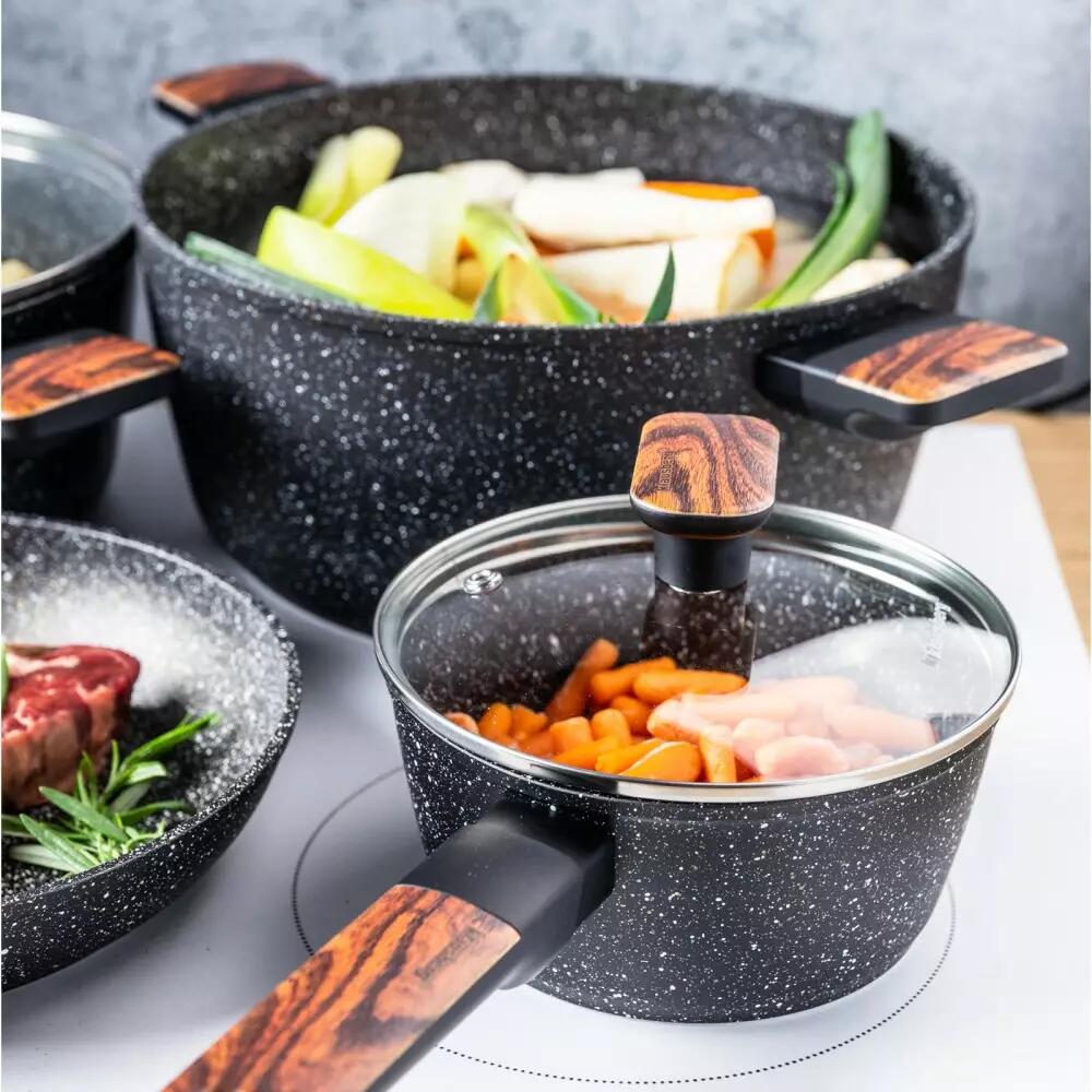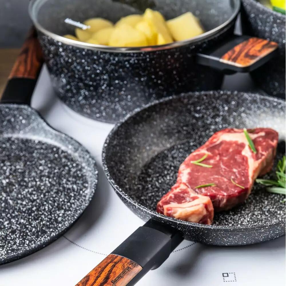 Învelișul marmorat folosit în acest set este o soluție inovatoare care combină avantajele vaselor din fontă și teflon. Este mai dur și mai rezistent decât teflonul tradițional, permițând în același timp o prăjire ușoară și o distribuție uniformă a căldurii. Ca urmare, fiecare masă este pregătită mai rapid și cu risc minim de arsură.
