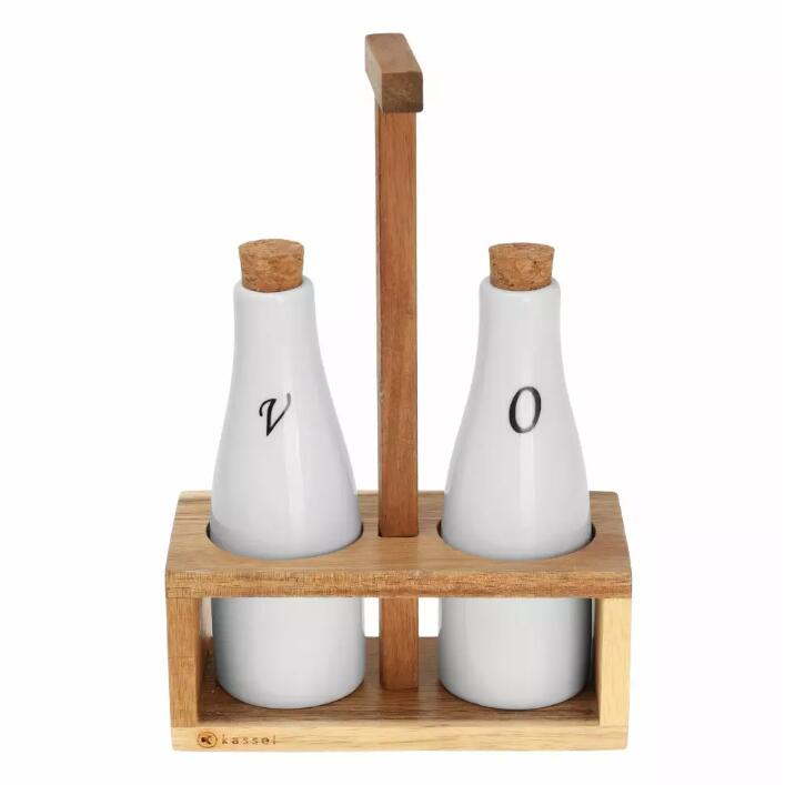Recipientele în sine sunt din porțelan, închise cu un dop natural, iar suportul este din lemn de salcâm.