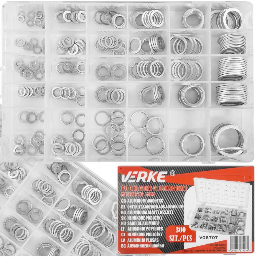Un set de 300 de șaibe din aluminiu pentru dopurile de golire a uleiului de la VERKE. Utile în orice atelier auto. Ambalate într-o cutie practică de plastic, cu separatoare pentru organizare și separare corectă pe dimensiuni.